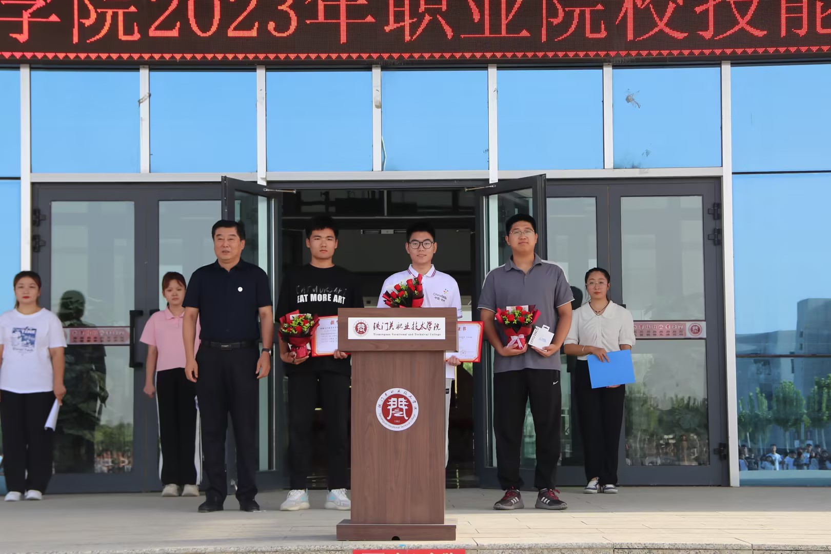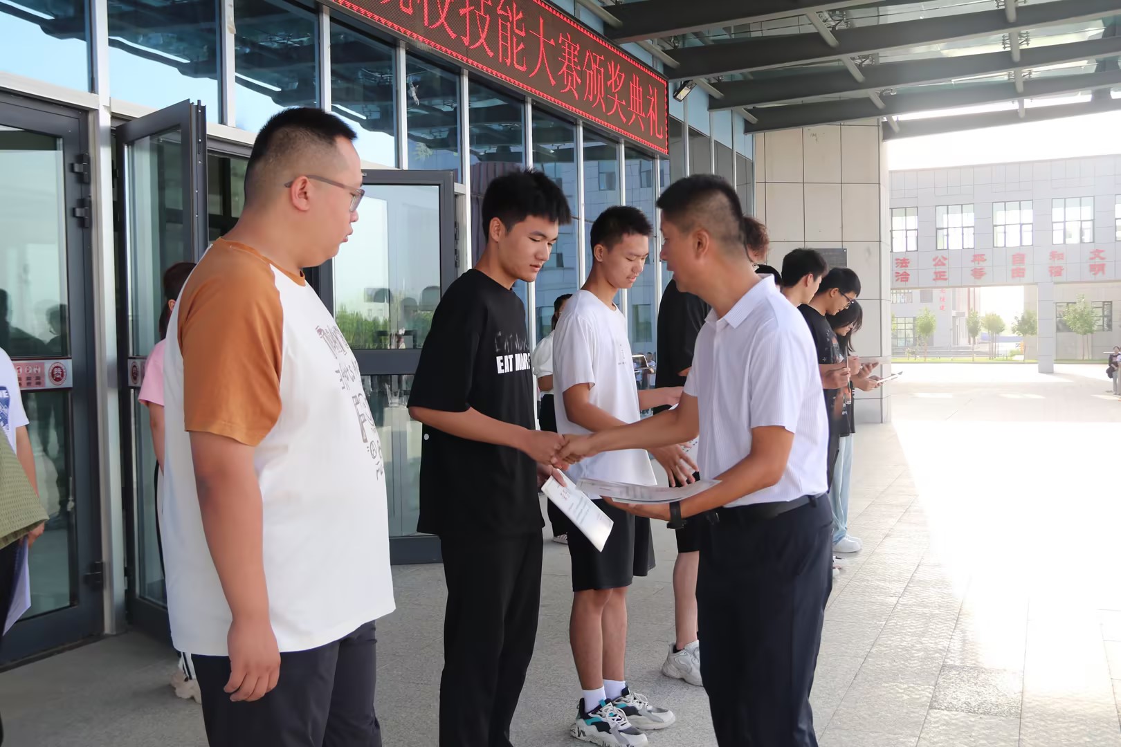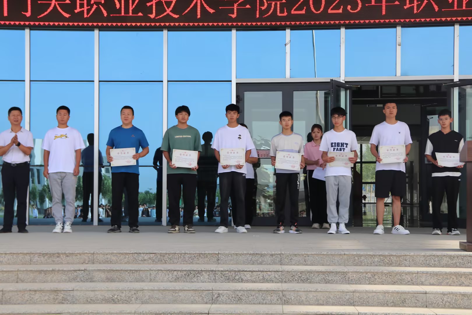 9月4日上午,bat365在线中国官网登录入口在燕赵楼前举办2023年职业院校技能大赛颁奖典礼,铁门关校区全体师生参加活动。