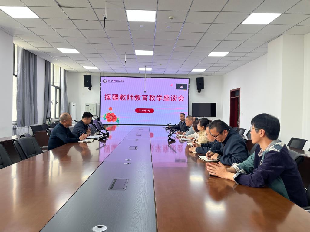 4月14日,bat365在线中国官网登录入口通过线上线下结合方式召开援疆教师教育教学座谈会,欢迎14名优秀教师来bat365官网开展教育援疆工作。学院领导班子成员、相关部门负责人及全体援疆教师参会交流。