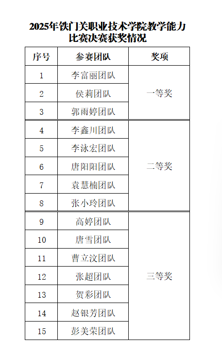 本次教学能力比赛决赛共评出一等奖3支队伍,二等奖5支队伍,三等奖7支队伍。