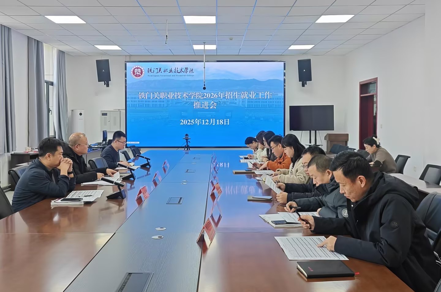 12月18日,bat365在线中国官网登录入口招生就业处组织召开2026年专业计划招生工作推进会。学院主管招生就业工作的领导、教务处、招生就业处及各分院负责人参加此次会议,共同为新一年招生工作谋篇布局。