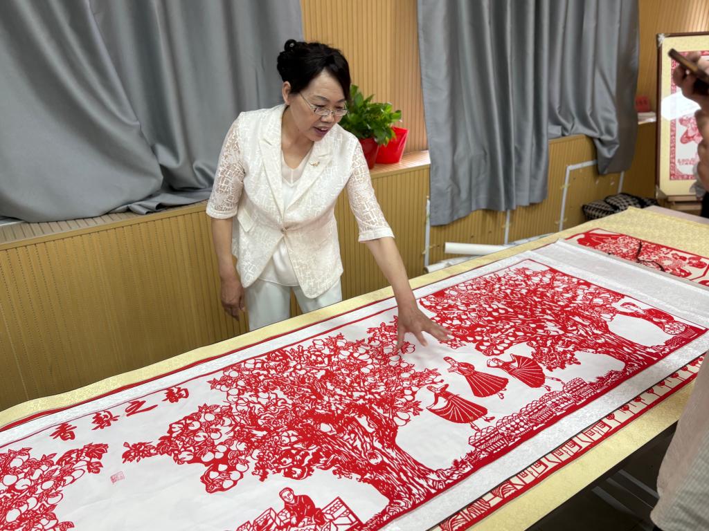 实践体验环节,张祖英现场展示其创作的“民族团结”“兵团精神”等主题剪纸作品,并讲解创作历程。师生们通过作品感受祖国和兵团的沧桑巨变。