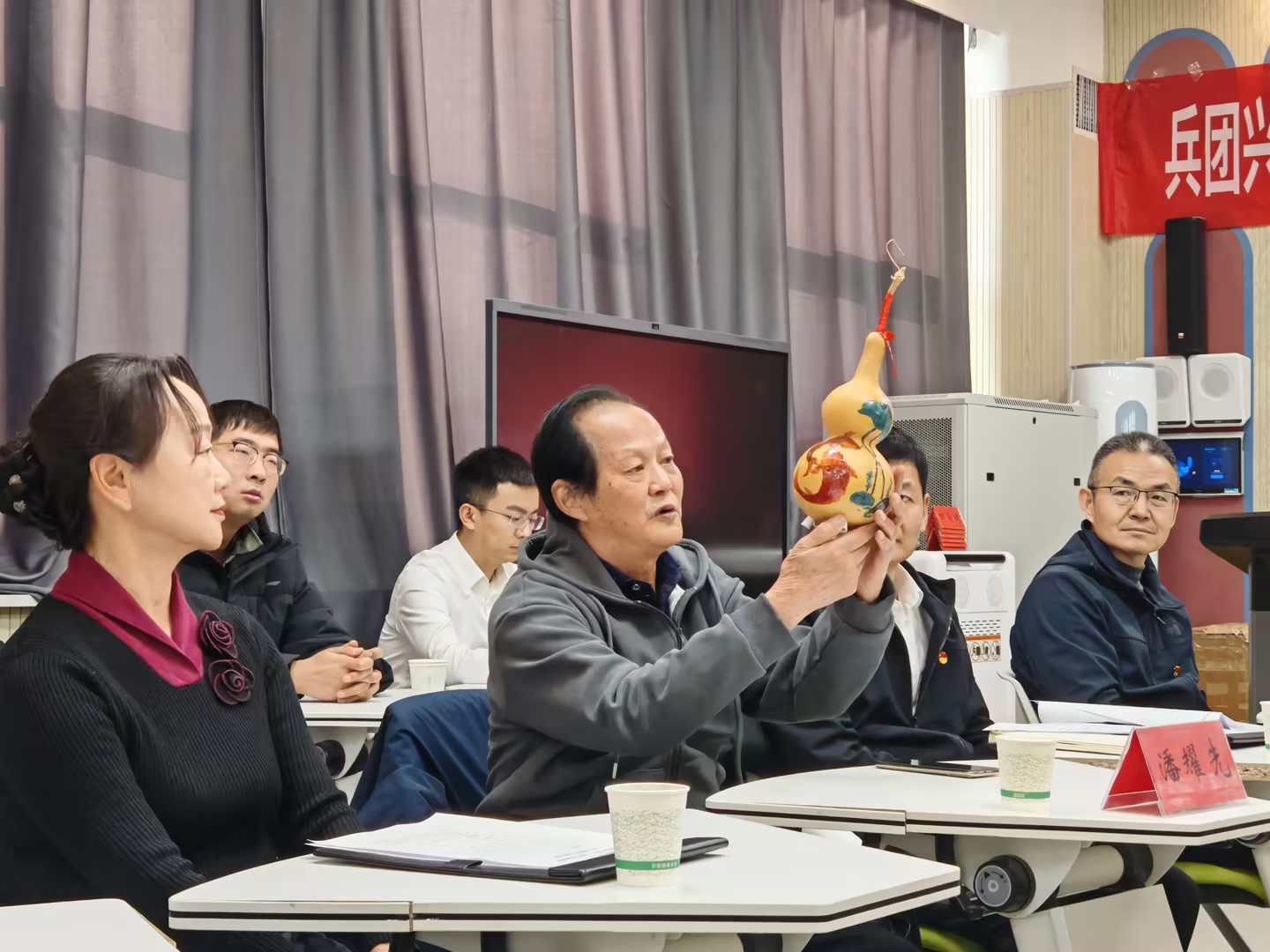 为推动中华优秀传统文化传承与党建工作深度融合,1月9日,bat365在线中国官网登录入口教育艺术学院党支部联合第二师铁门关市文化体育广电和旅游局党支部在精技楼307智慧教室举办“匠心传承守初心・非遗文化润校园”主题党日活动。第二师铁门关市文化体育广电和旅游局副局长刘明星,第二师三〇团双丰葫芦烙画传承人潘耀先与第二师铁门关市文化体育广电和旅游局党支部全体党员、教育艺术学院党支部全体党员教师及师生代表参加活动。