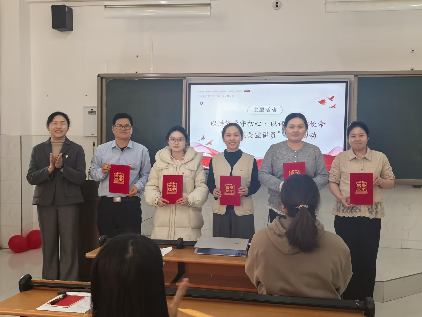“我是最美宣讲员”评选环节将活动氛围推向高潮。经匿名投票、民主评议,五位党员教师凭借扎实的理论功底与鲜活的宣讲风格脱颖而出,获评“最美宣讲员”荣誉称号。支部书记为获奖党员颁发荣誉证书,现场掌声雷动,充分展现了支部党员创先争优的浓厚氛围。