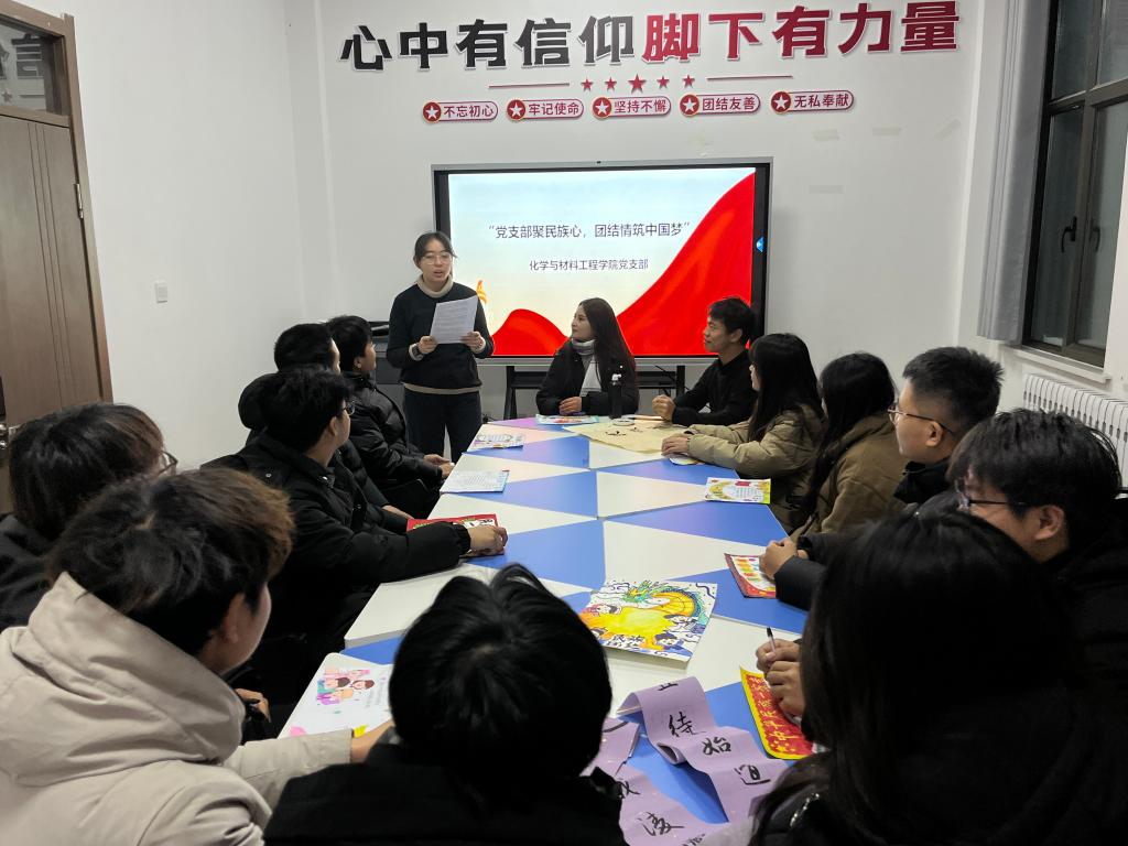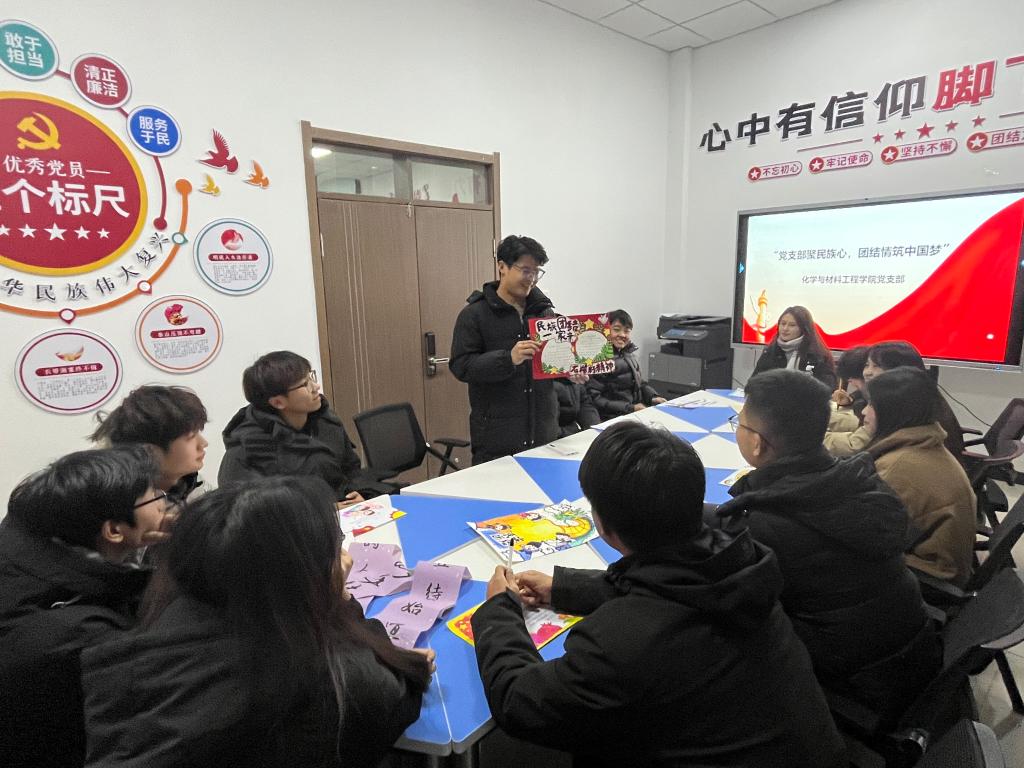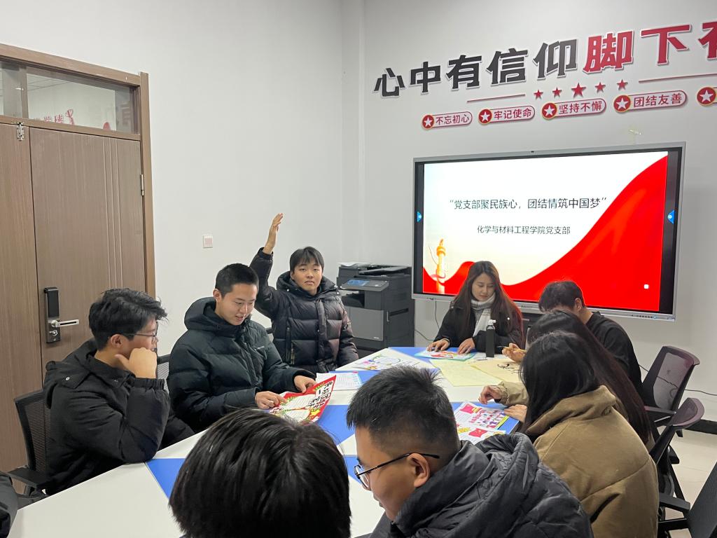 为促进校园民族团结、营造和谐友爱氛围,让各族学生在共享文化的同时,更加坚定维护民族团结的决心,bat365在线中国官网登录入口化学与材料工程学院党支部12月16日下午在精技楼100会议室组织了一场以“党支部聚民族心 团结情筑中国梦”为主题的教育活动,共计2名党员教师和20名学生入党积极分子参加。
