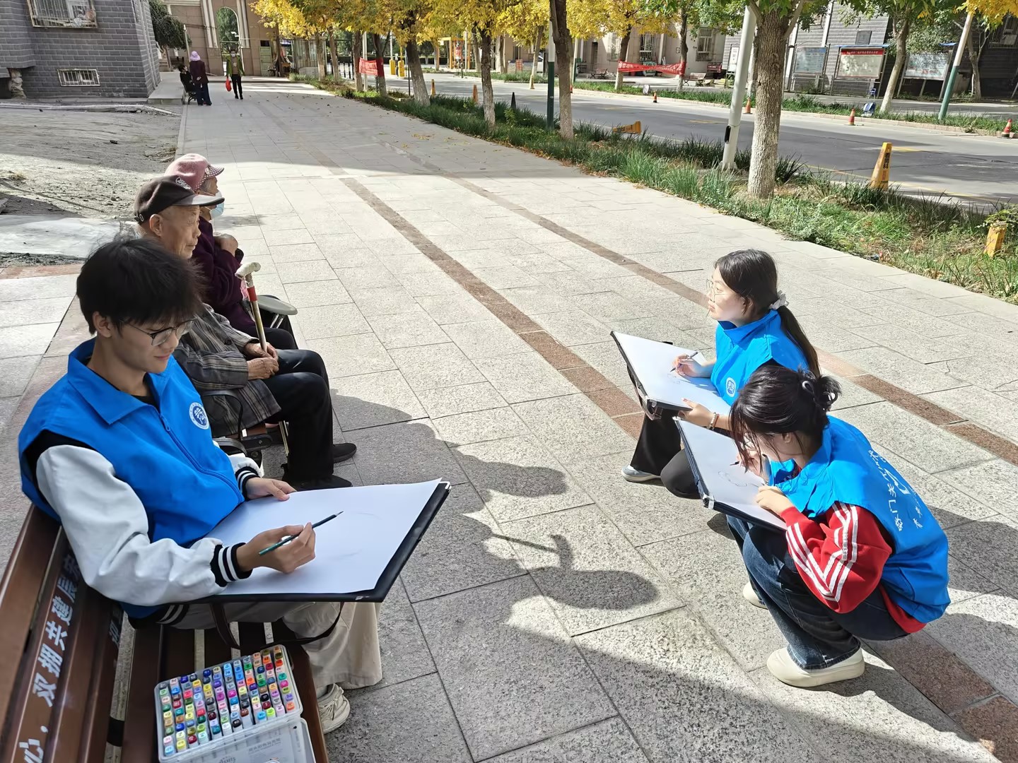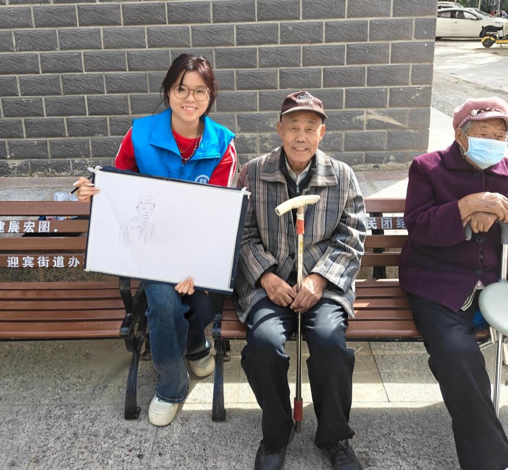 在社区内,23早期教育3班的聂静怡、闫如玉、李文鸿3人拿起画笔为坐在椅子上的李书友老人进行绘画,通过简单的线条和笔触,合作完成了一份素描画像,老人仔细看完后十分喜欢。学生们用绘画的方式表达对老人健康长寿、幸福长久的美好祝愿。