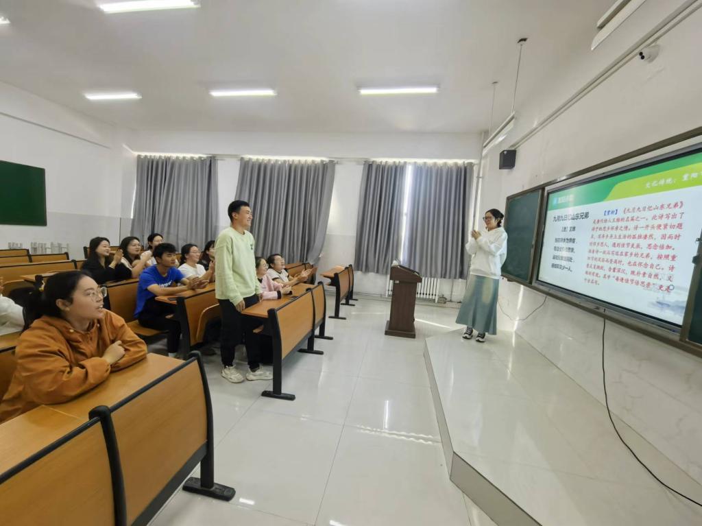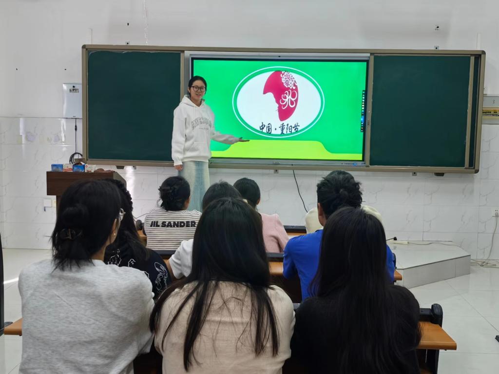 10月11日,在燕赵楼215室,曹玉婷老师通过音视频、照片展示了重阳节相关习俗,如登高、赏菊、插茱萸、吃重阳糕等,大家通过朗读王维的《九月九日忆山东兄弟》,抄写重阳节诗句,朗诵重阳节谚语,来表达敬老之情。