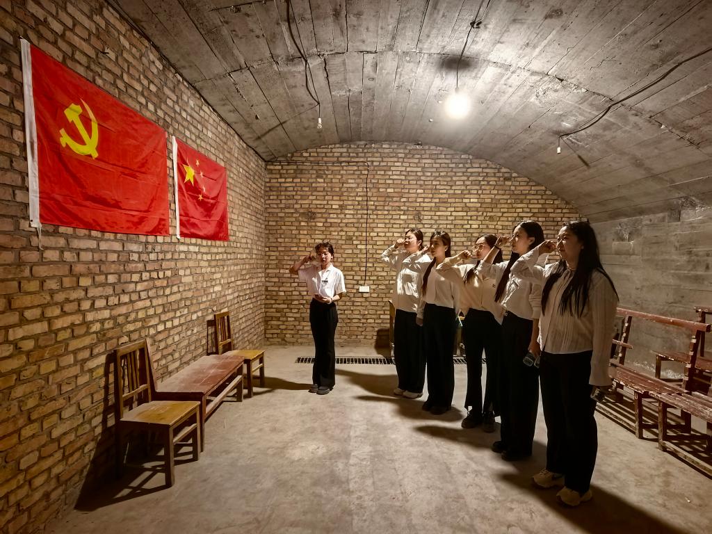 在司令员家属居住地遗址,简陋的家具与狭小空间重现老一辈革命者艰苦奋斗的生活场景。师生触摸历史痕迹,感悟马兰精神内涵。活动尾声,全体人员走进全长300米的三号防空洞遗址,在参观过指挥室、首长室等21处洞穴后,全体党员在此重温入党誓词,誓言回荡间,党员与团员青年深刻体悟先辈“使命如山、忠诚报国”的担当。