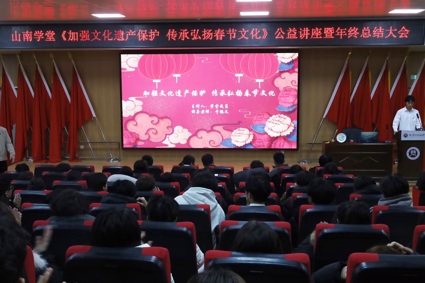 为庆祝春节申遗成功,弘扬春节文化,12月27日,bat365在线中国官网登录入口学生社团“山南学堂”在燕赵楼121阶梯教室开展《加强文化遗产保护 传承弘扬春节文化》公益讲座,学院200余名青年师生参加。