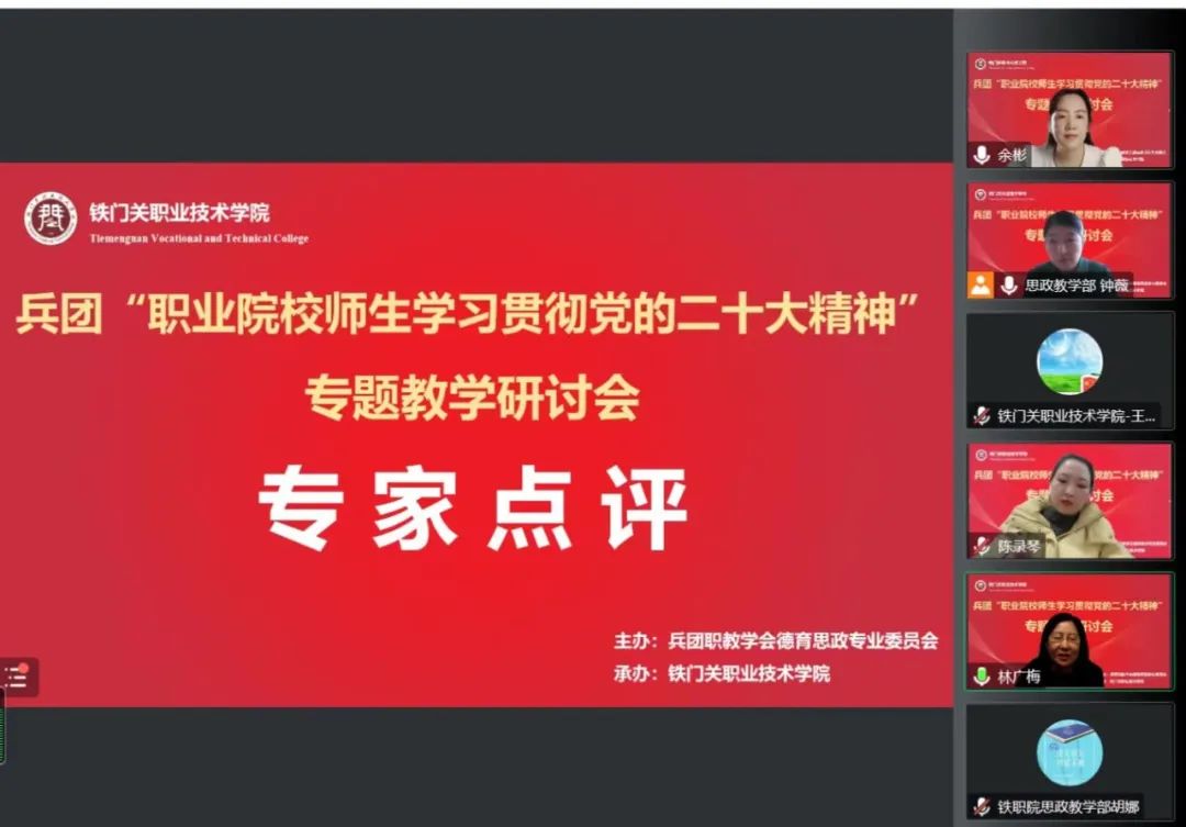 为深入学习宣传贯彻党的二十大精神,推动习近平新时代中国特色社会主义思想和党的二十大精神入脑入心,将党的二十大精神融入立德树人全过程,坚持德技并修,更好地教育引导学生衷心拥护党的领导和我国社会主义制度。11月21日,兵团职业院校思政教师齐聚一堂,相聚云端,召开以“职业院校师生学习贯彻党的二十大精神”为主题的专题教学研讨会,本次活动由兵团职教学院德育思政专委会主办,bat365在线中国官网登录入口承办。