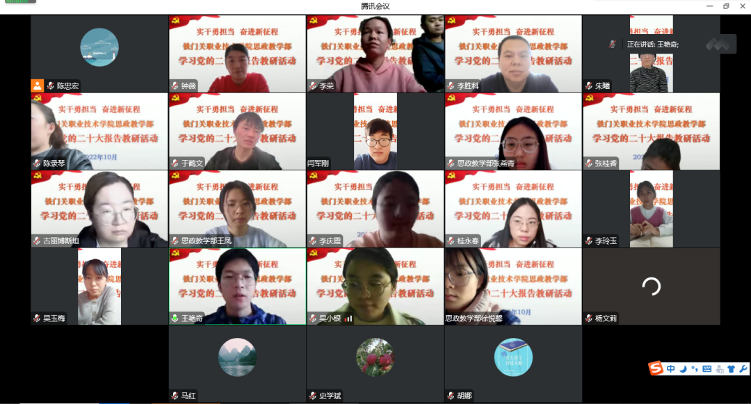 一是以研促教,常态化开展线上教研活动。利用每周三下午定期召开线上教研活动。通过反馈听课评课情况、开展主题学习、交流学习心得等方式,丰富教研活动内容。二是依托教学评价,改进教学水平。10月中旬,配合教务处组织师生参加教学评价,依据评价结果进行分析总结,肯定成绩,补齐短板,激励教师不断改进教学方法,完善教学指导。三是举办专家讲座,提升教师科研水平。先后邀请华中科技大学、北京信息职业技术学院思政教育专家,分别就“如何上好思政课”“把党的二十大精神全面融入思政课教学”等内容进行专题讲授,进一步帮助思政教师拓宽教学思路,创新教学方法,提升育人效果。
