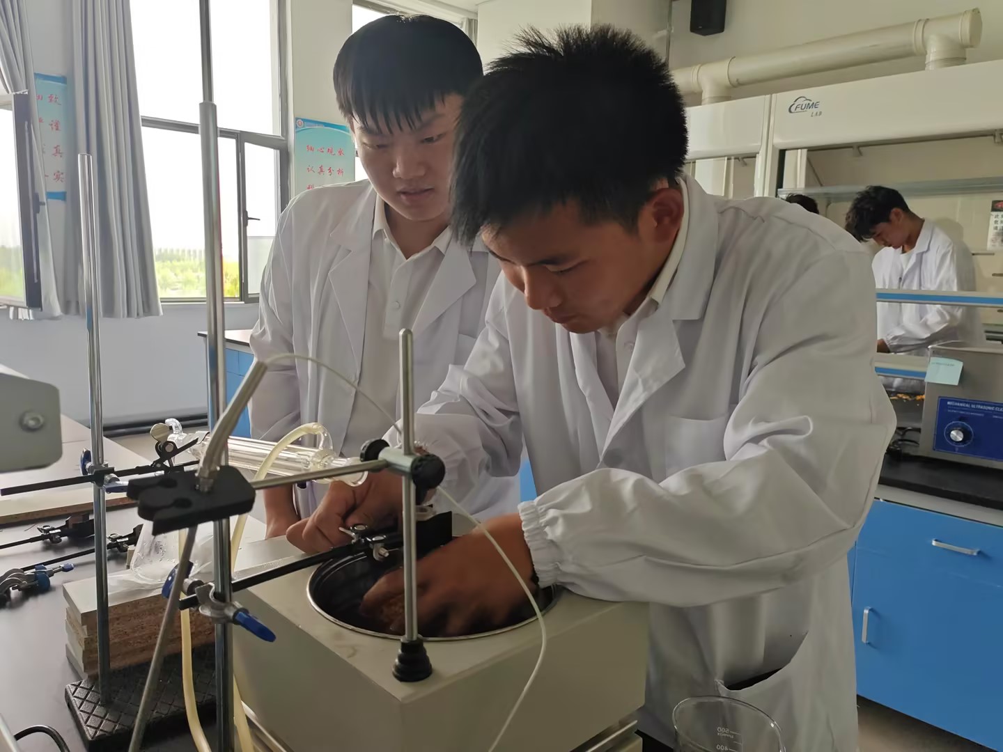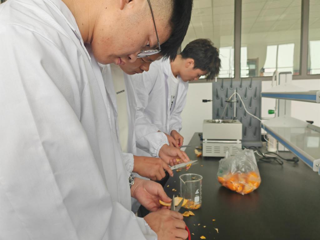 5月13日,在化工实训中心无机及分析实验室里,满屋橘香四溢,同学们有条不紊地进行橘子精油提取。