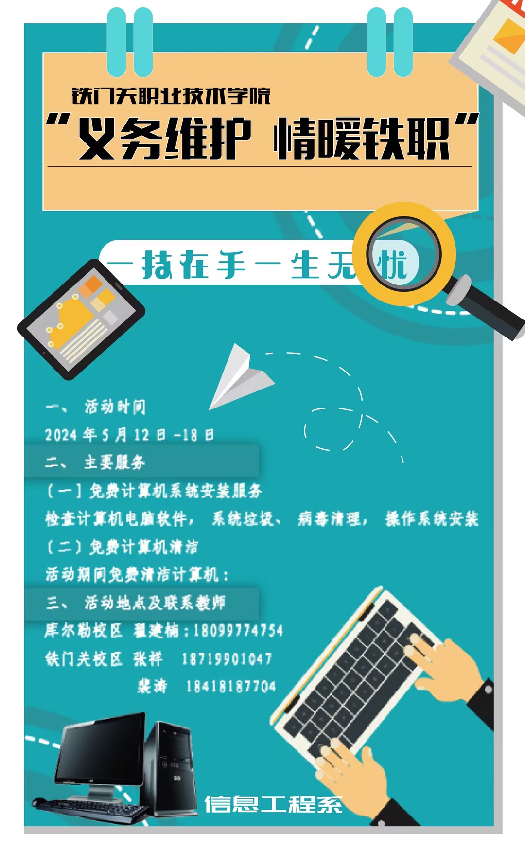 为将职业技能应用于实践,5月12日至5月18日,bat365在线中国官网登录入口信息工程系组织教师及学生志愿者,面向全体师生开展“义务维护,情暖铁职”计算机系统维护与清洁志愿服务活动。
