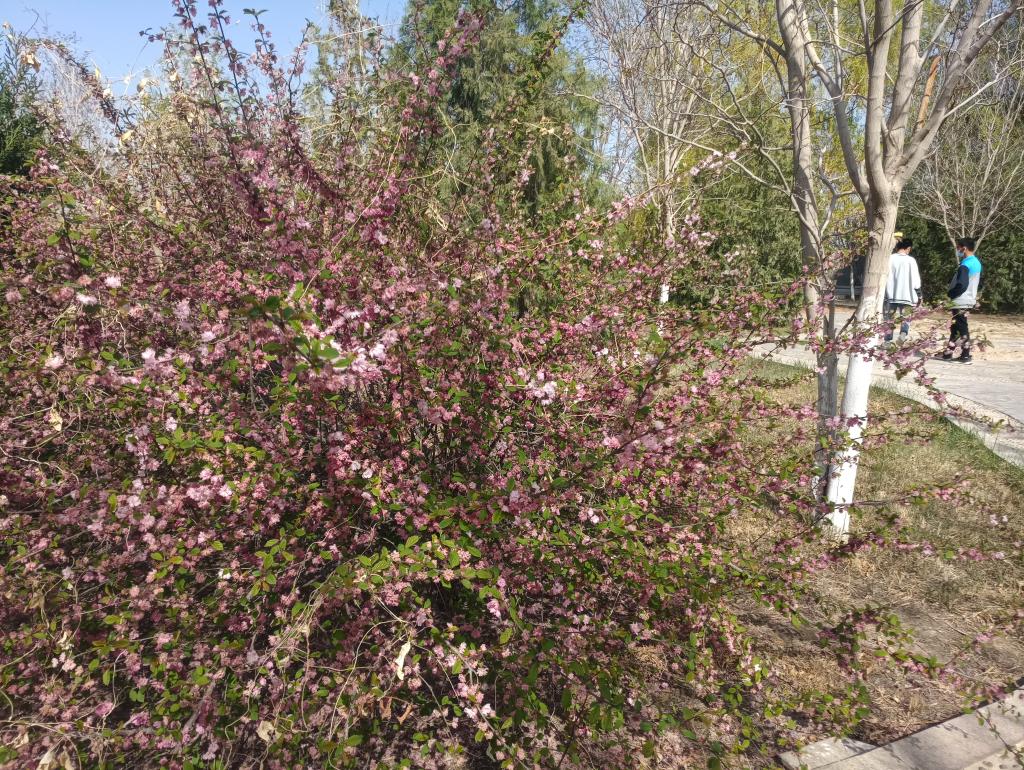 海棠已开过了盛期,夹杂其间的是淡淡的新绿。课间时分,同学们在其间游玩散步,好不惬意。也有那好奇的,走上前去,一边问道“这是什么花呀?”一边凑近了观赏那点缀其间的小小蜜蜂,欢声笑语中,令春日更添一抹朝气。