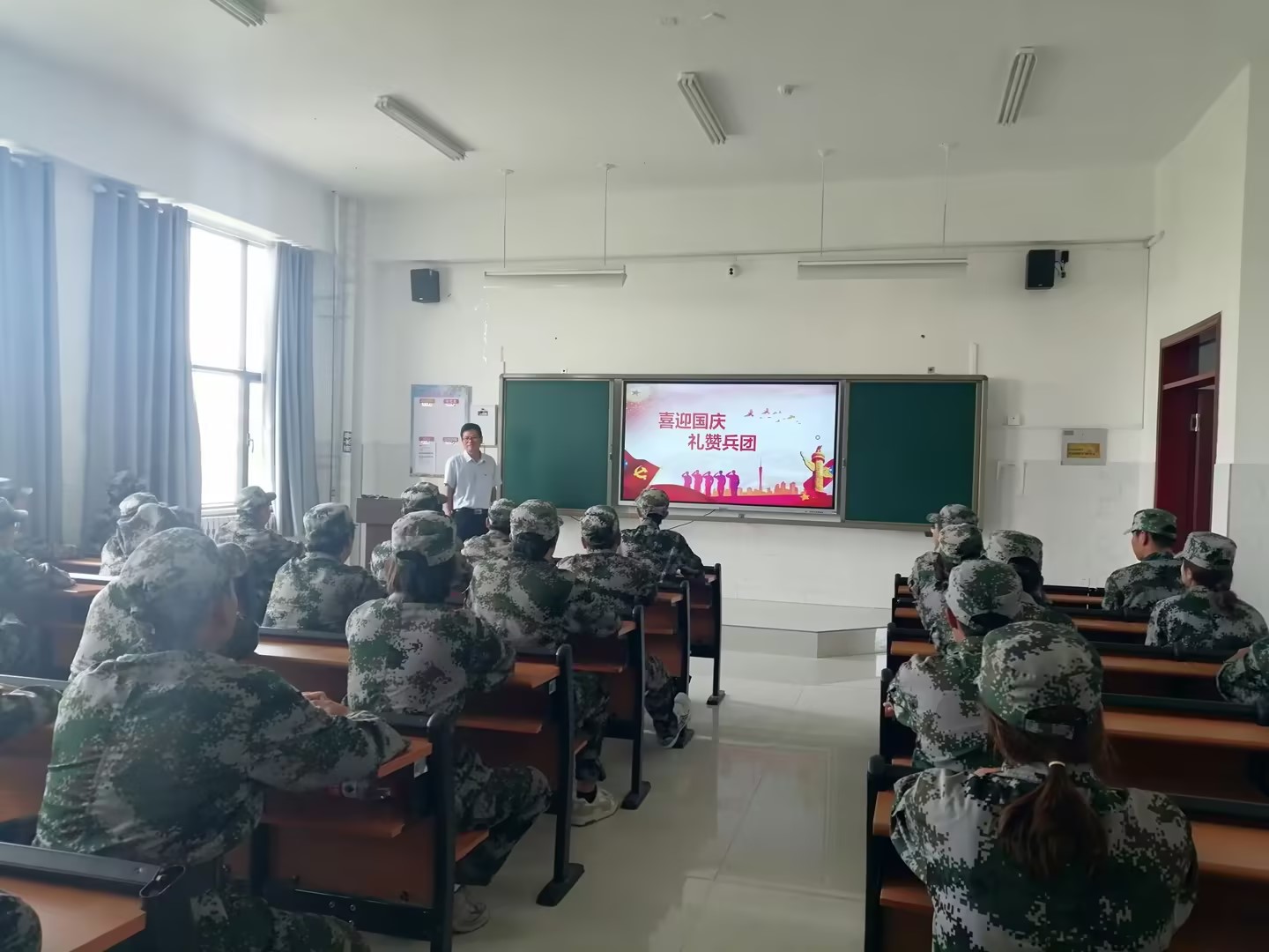 在《喜迎国庆,礼赞兵团》主题教育课上,大家围绕新时代党的治疆方略、民族团结教育、微视频《“丝路雄关”铁门关》、学院概况、励志话语五部分进行了学习。