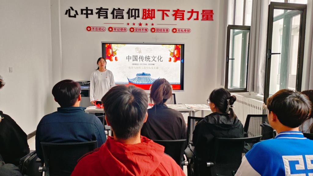10月8日晚,为进一步弘扬中华民族优秀传统文化,增强学生文化自信,bat365在线中国官网登录入口化学与材料工程学院党支部在精技楼100会议室组织开展了以“传承中华之美,坚定文化自信”为主题的党日活动,全体党员、入党积极分子和学生代表共计20余人参加。