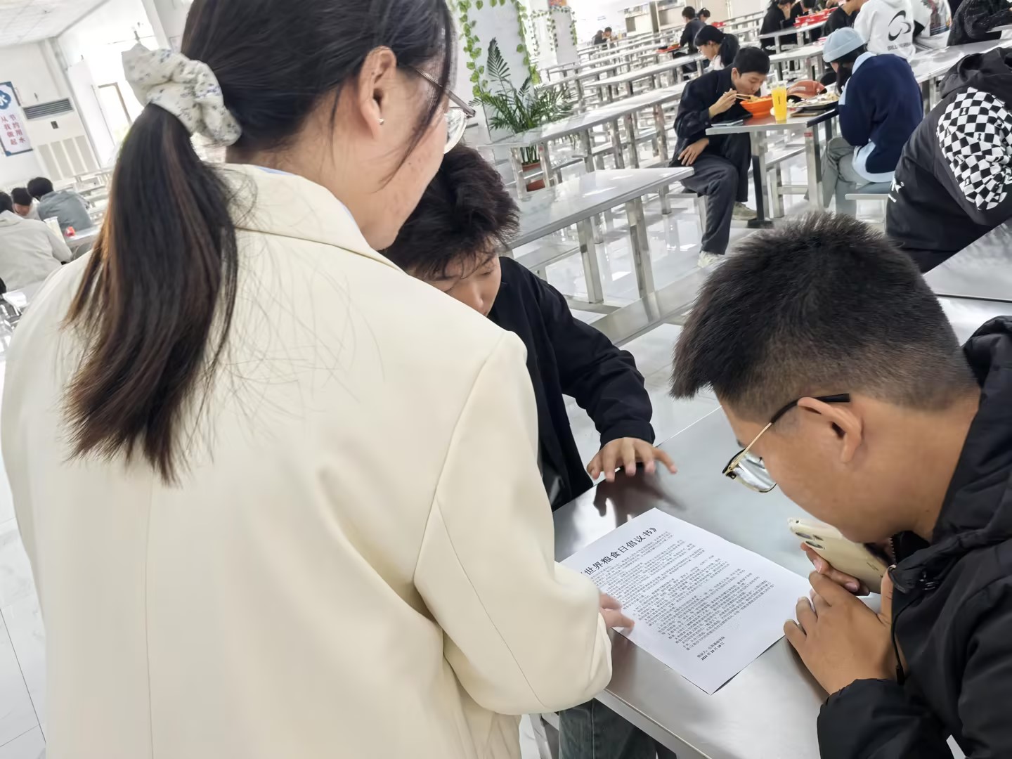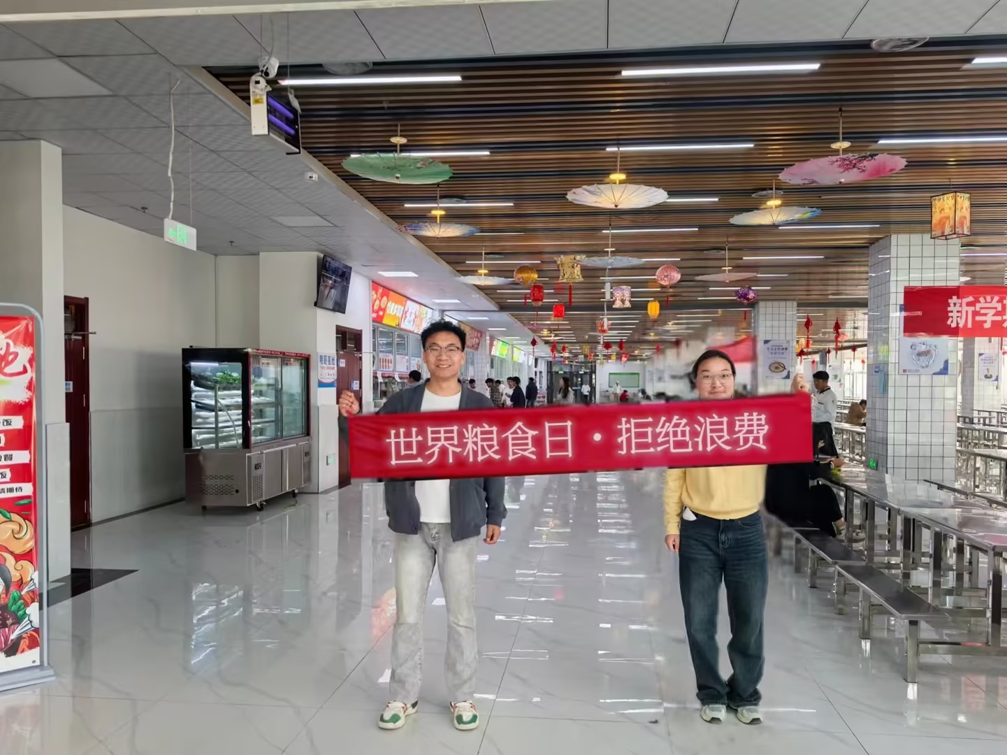 随后,大家来到学院食堂,开展“世界粮食日”宣传活动,通过发放宣传单、拉横幅的方式开展宣传,向大家科普目前食物浪费现状,发出光盘节粮的倡议,适量取食,一起向舌尖上的浪费说“不”,崇尚节俭的“新食尚”,让每一餐都成为对生命的敬畏与感恩。