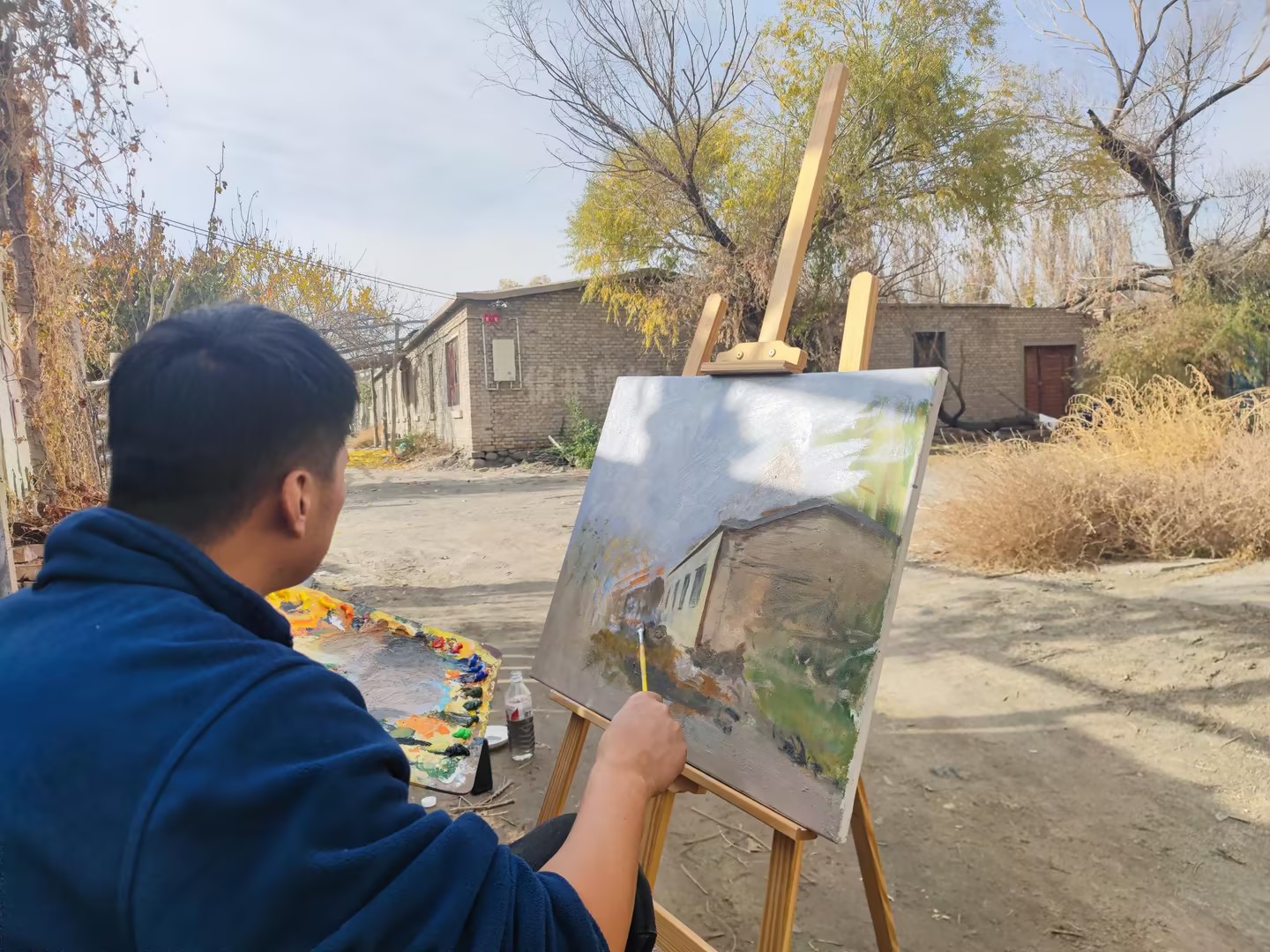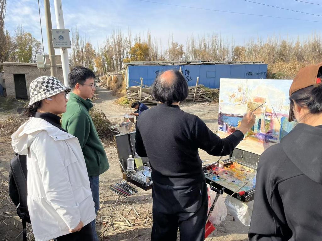 紧接着,教研室的老师们踏上了户外写生的旅程,在第二师铁门关市29团团场旧址,这个充满历史痕迹的地方,一砖一瓦都承载着过去的故事,为老师们提供了丰富的创作素材。他们用油画、国画、速写、水彩等不同的艺术形式,捕捉和再现了这些独特的场景,将历史的温度和生活的气息融入到画布之中。