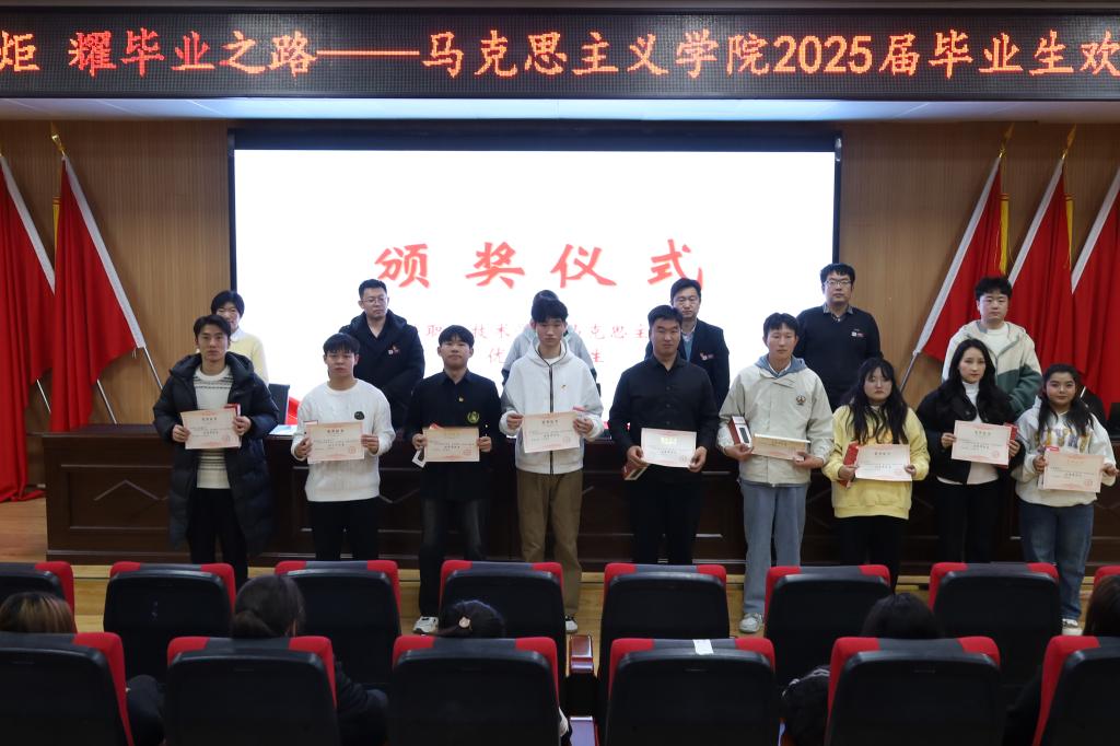 晚会伊始,马克思主义学院党支部书记、院长钟薇发表致辞。她回顾了2025届毕业生在学院学习、生活和成长的青春记忆,对即将离校去实习的学生们在校两年多的努力和成绩给予高度认可,也表达了对他们的不舍与祝福,希望他们在未来的道路上能够一路长虹,前程似锦。随后,宣布荣获马克思主义学院优秀学生的名单,并为其颁发荣誉证书和奖品。