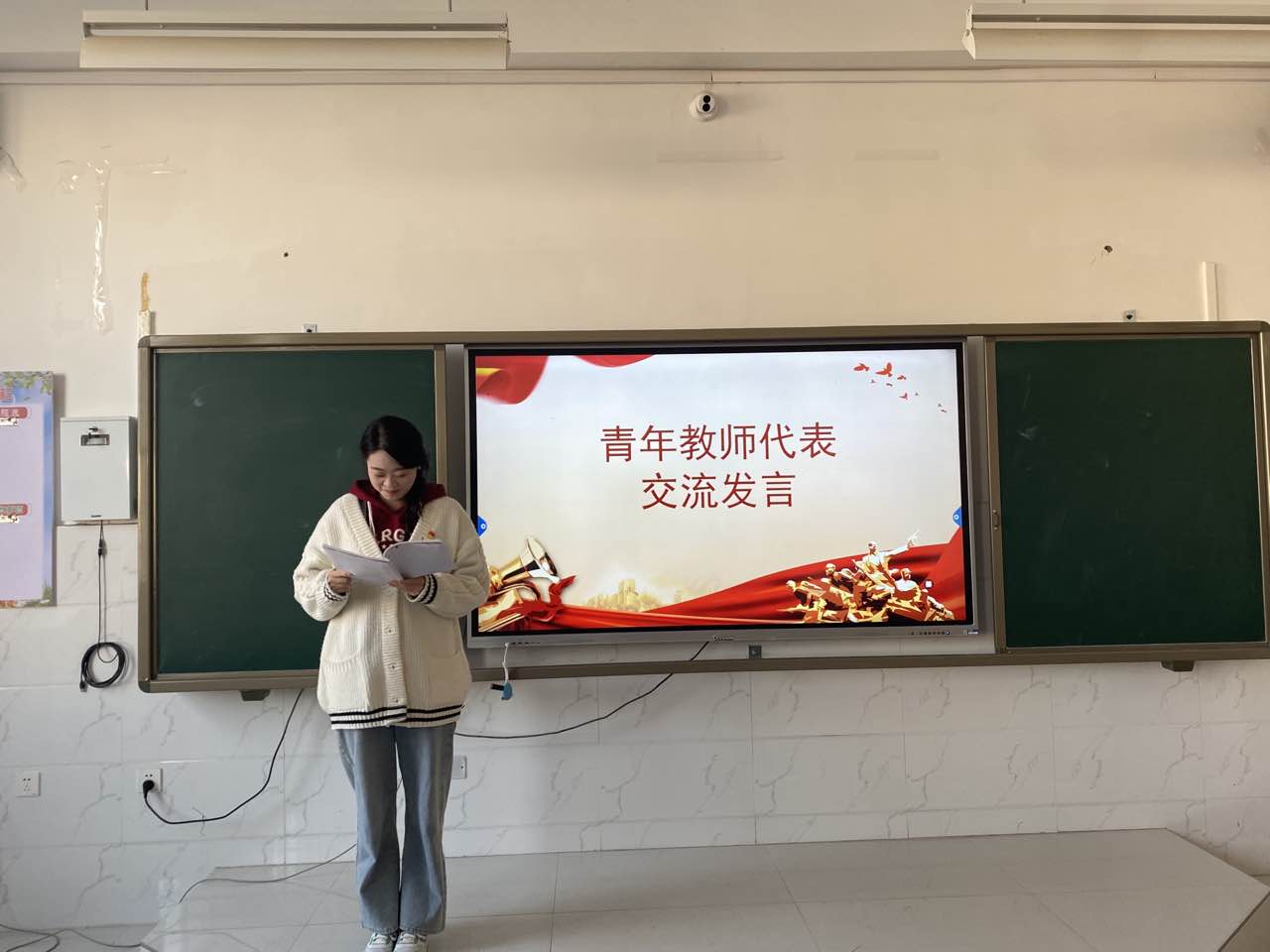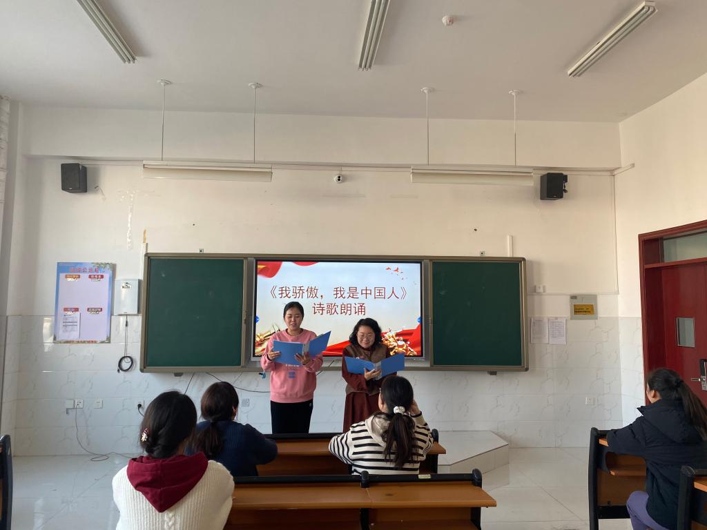侯莉、丁婕老师以饱满的热情,用抑扬顿挫的声音,激情朗诵诗词《我骄傲,我是中国人》,点燃了青年教师们的青春之火,在浓厚的爱国氛围中结束了纪念活动。