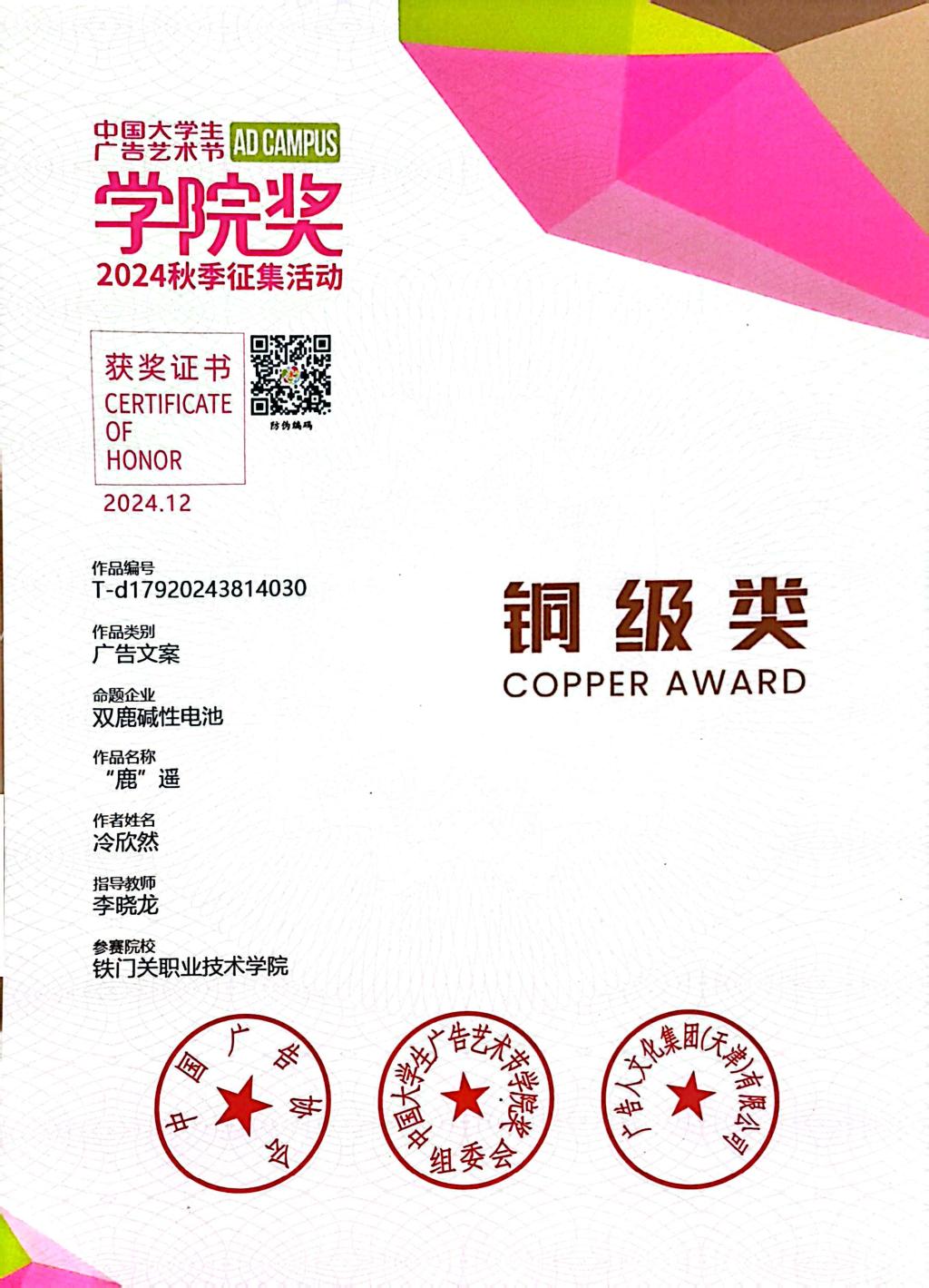 “祝贺你们在20多个命题,150多万人创造的50多万件的作品当中脱颖而出,你们用实力打破质疑,赢得了在场300多位评委的认可,掌声送给自己!”广告人文化集团总裁穆虹这样说道。12月26日,北京广播大厦的2号演播厅会议现场,bat365在线中国官网登录入口信息智能工程学院李晓龙教师指导的23数字媒体技术1班学生冷欣然,在中国大学生广告艺术节学院奖2024秋季征集赛中获得双鹿电池命题的文案类全国铜奖,此奖项是学院目前在传媒类赛事中取得的最好成绩。