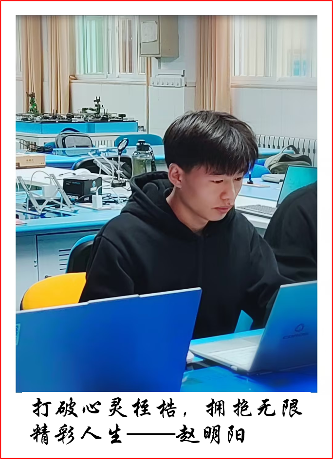 过往的经历让赵明阳对自己有了清晰的认知,他深知自身优势与不足,也明确了未来努力的方向。未来,他将继续秉持积极向上的心态,怀揣对专业的热爱,不断挑战自我,在技能提升的道路上永不止步,向着更高的目标奋勇前行,立志在职业教育领域书写更加辉煌的篇章。