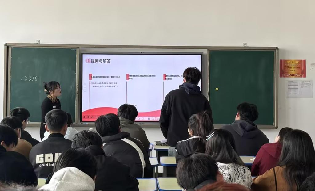 活动紧扣“守护消费安全,培育法治公民”主题,系统讲解《中华人民共和国消费者权益保护法》《网络交易监督管理办法》等法律法规。授课教师通过多媒体课件展示、典型案例视频解析,重点解读网络购物欺诈、预付式消费陷阱、直播带货虚假宣传等新型侵权行为的法律界定与维权路径,强调“每位学生既是市场经济的参与者,更是法治社会的建设者”。