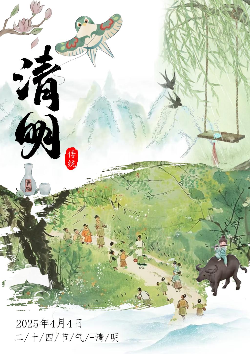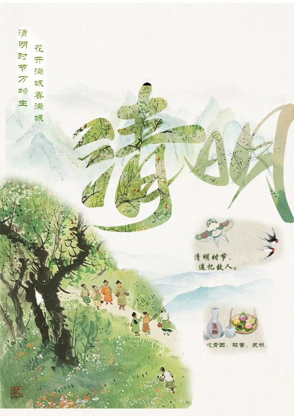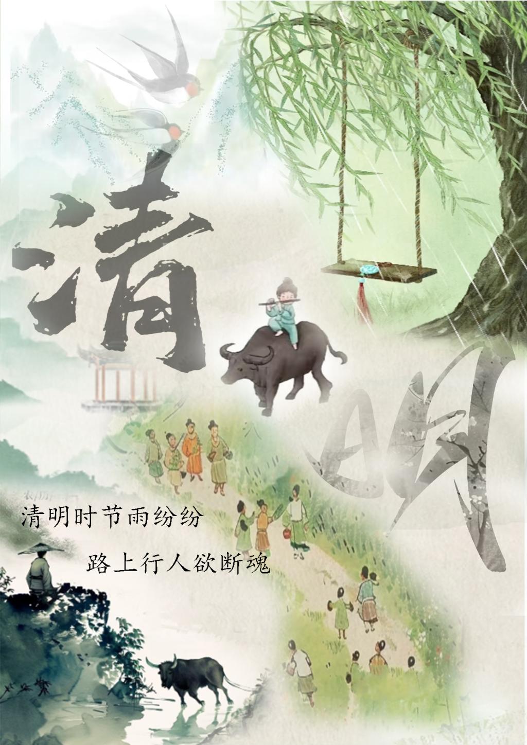 课程采取“文化解析+技术实践”的教学模式。教师通过多媒体资料系统讲解清明节“祭扫追思”与“春耕踏青”的文化内涵,并结合专业课程特点,对海报设计的构图原理、色彩搭配及图片处理技巧进行示范讲解。在实践环节,学生运用Photoshop软件进行创作,将柳枝、纸鸢等传统文化符号与现代设计语言相结合,通过冷暖色调对比、视觉层次构建等手法,呈现清明节特有的文化意蕴。