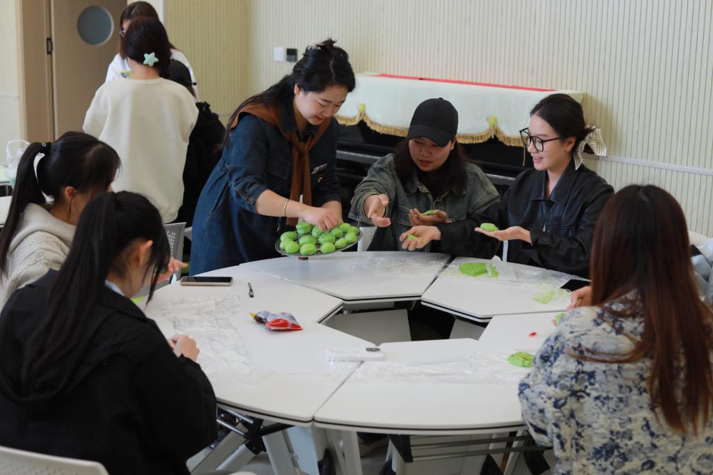活动伊始,首先进行的是青团制作活动。教育艺术学院团总支书记围绕清明节的历史沿革、文化习俗展开讲解,着重阐释青团“追思怀远、万物新生”的象征意义。在教师指导下,学生通过和面、包馅、塑形等工序,完成传统青团制作实践,在劳动体验中体悟节气饮食文化内涵。
