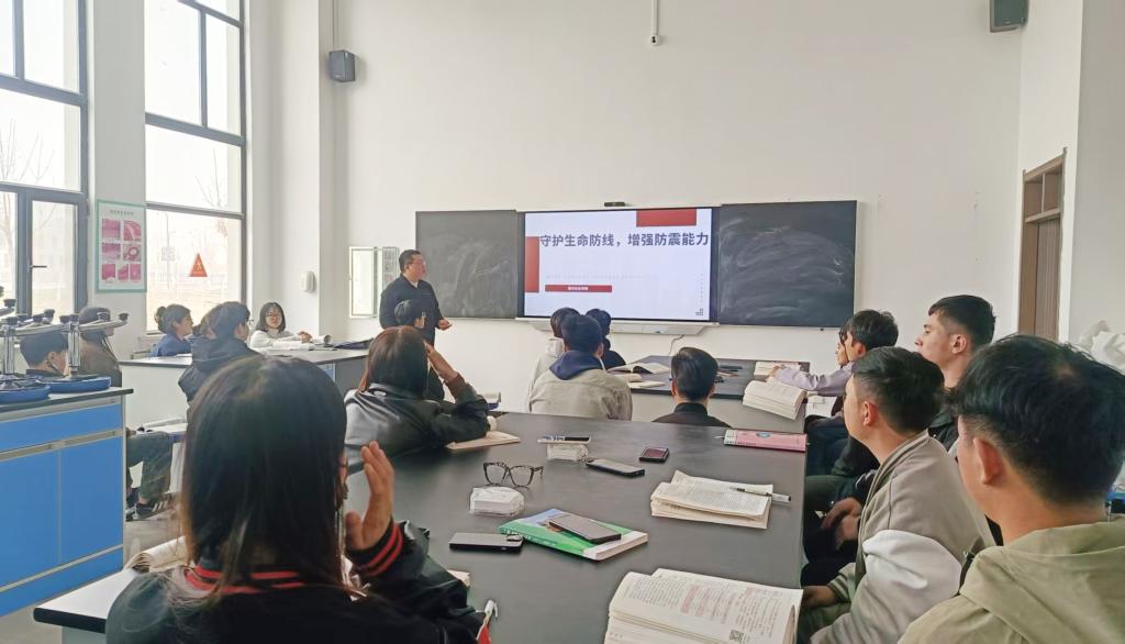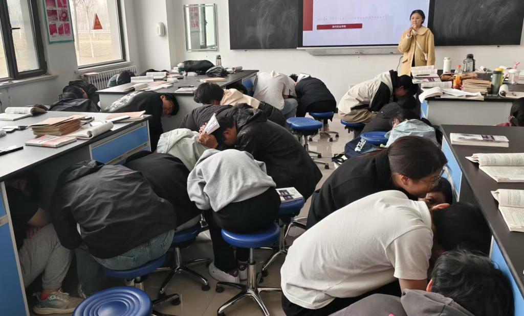 本次活动以3月28日缅甸7.9级地震等国际重大灾害为教学案例,分设知识讲座、情景模拟、应急演练三大板块。专业教师运用多媒体课件,系统讲解地震预警机制、安全三角区定位、建筑物避震要点等专业知识,特别针对实验设备密集的特点,重点剖析了实验室、实训车间等特殊场景的避险策略。在模拟演练环节,现场师生按照应急预案,有序完成“伏地、遮挡、手抓牢”标准避险动作,并在2分钟内完成指定路线撤离。