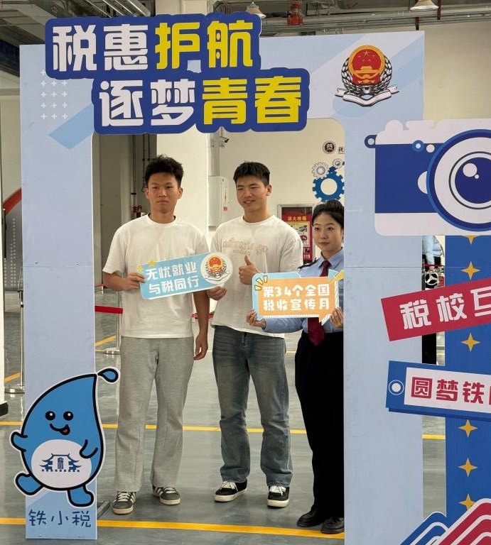 活动现场,精心布置的主题展板前人头攒动。税务干部通过知识抢答、有奖打卡等互动游戏,引导同学们在轻松愉快的氛围中回顾、巩固税收知识,并通过发放“铁小税”文创周边、设置趣味拍照打卡区,吸引了众多学生参与。23新能源汽车检测与维修技术1班学生王云赛说道:“这次活动让我深刻认识到税收与我们的生活息息相关,尤其是税务老师讲解的大学生创业就业税费优惠政策,对我们未来创业就业帮助极大。”