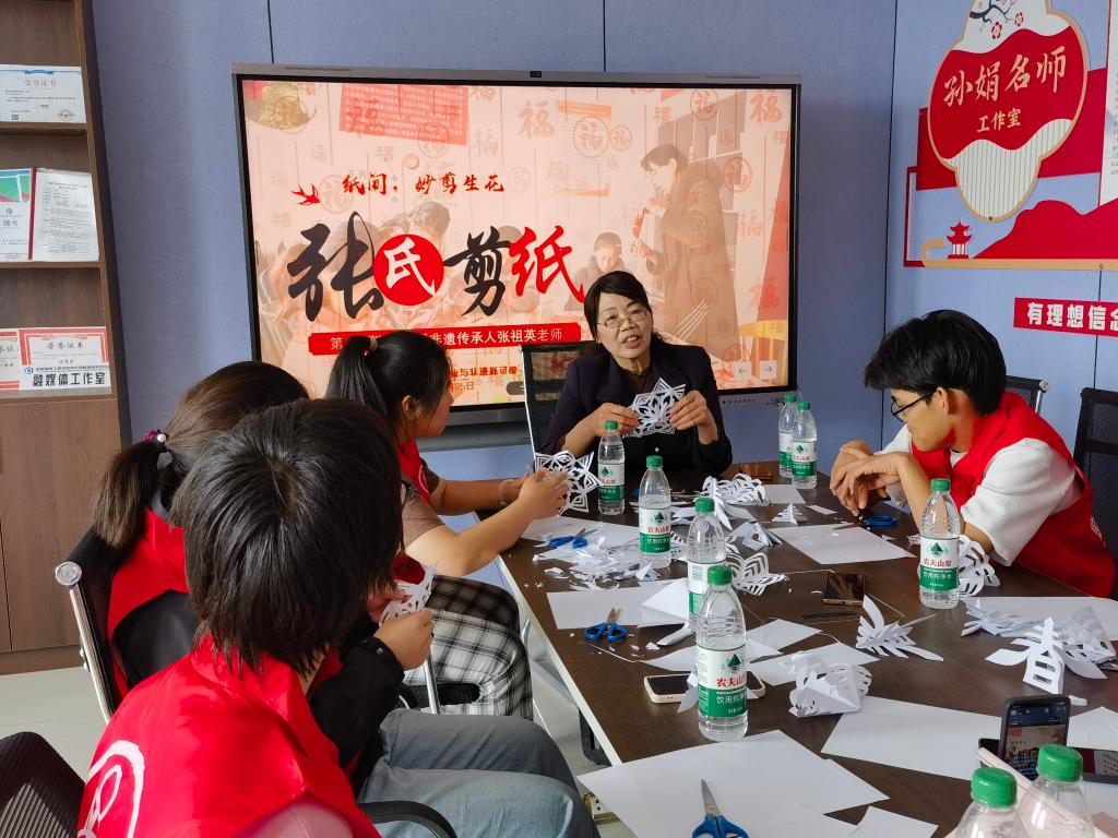 4月26日,“遗艺同行”公益社团指导教师李晓龙邀请二师铁门关市非物质文化遗产“张氏剪纸”代表性传承人张祖英走进bat365在线中国官网登录入口,为4名残障学生开展了一场别开生面的剪纸公益培训,活动在学院孙娟名师工作室进行,社团10名成员参加。