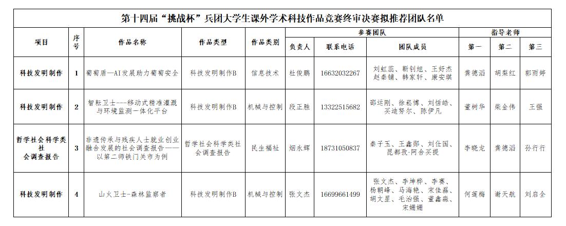 按照兵团团委《关于组织开展第十四届“挑战杯”兵团大学生课外学术科技作品竞赛的通知》要求,经二级学院初赛、校级决赛选拔,拟推荐4个团队参加第十四届“挑战杯”兵团大学生课外学术科技作品竞赛终审决赛(具体名单见附件),现对拟推荐团队予以公示。