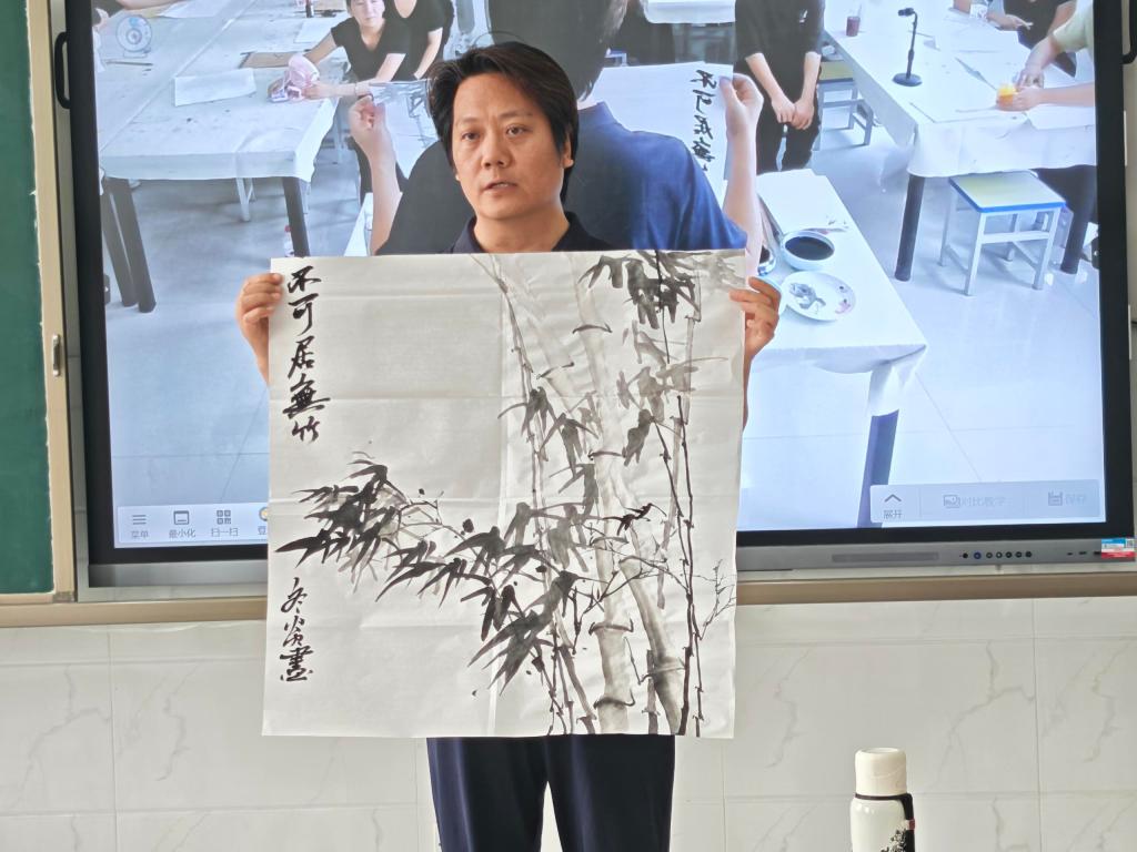 随后,援疆教师王冬炎以“竹之品格”为主题,为学生带来了一场生动的国画教学。他从竹子“虚心有节”的文化内涵讲起,详细讲解了国画中竹子的构图要领和笔墨技法。接着,从竹子的形态特征入手,详细剖析了国画中竹子的绘画技巧,包括竹的挺拔走势、竹叶的疏密分布以及笔墨的运用等关键要点。