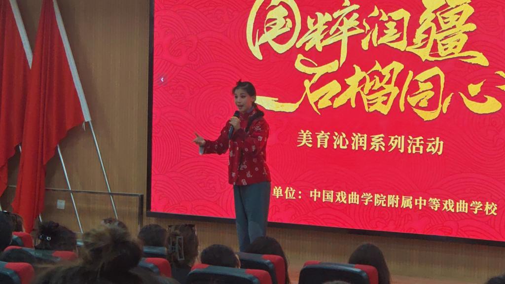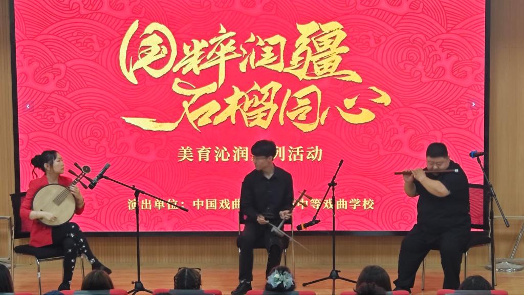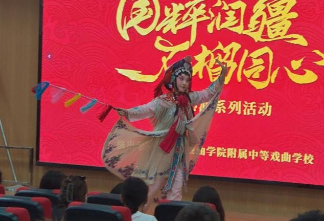 演出中,《清风韵》选段《有一种品格叫担当》传递了艺术承载的精神内涵。民族管乐串吹《华夏同心曲》紧扣活动主题,展现了民族艺术的融合。整场演出涵盖经典唱段、器乐演奏、折子戏片段等多种形式,让师生近距离感受戏曲艺术的独特魅力。