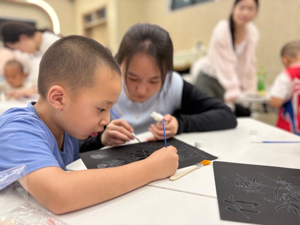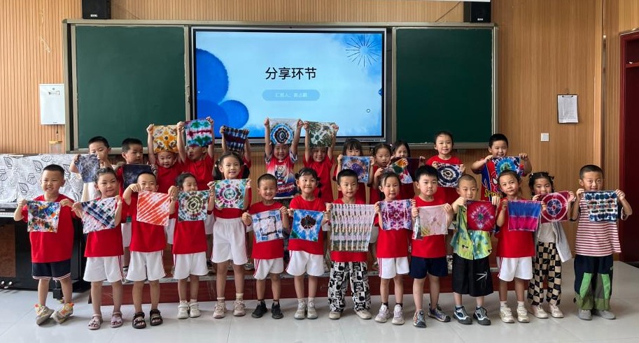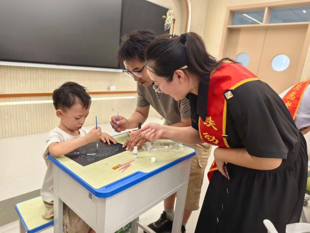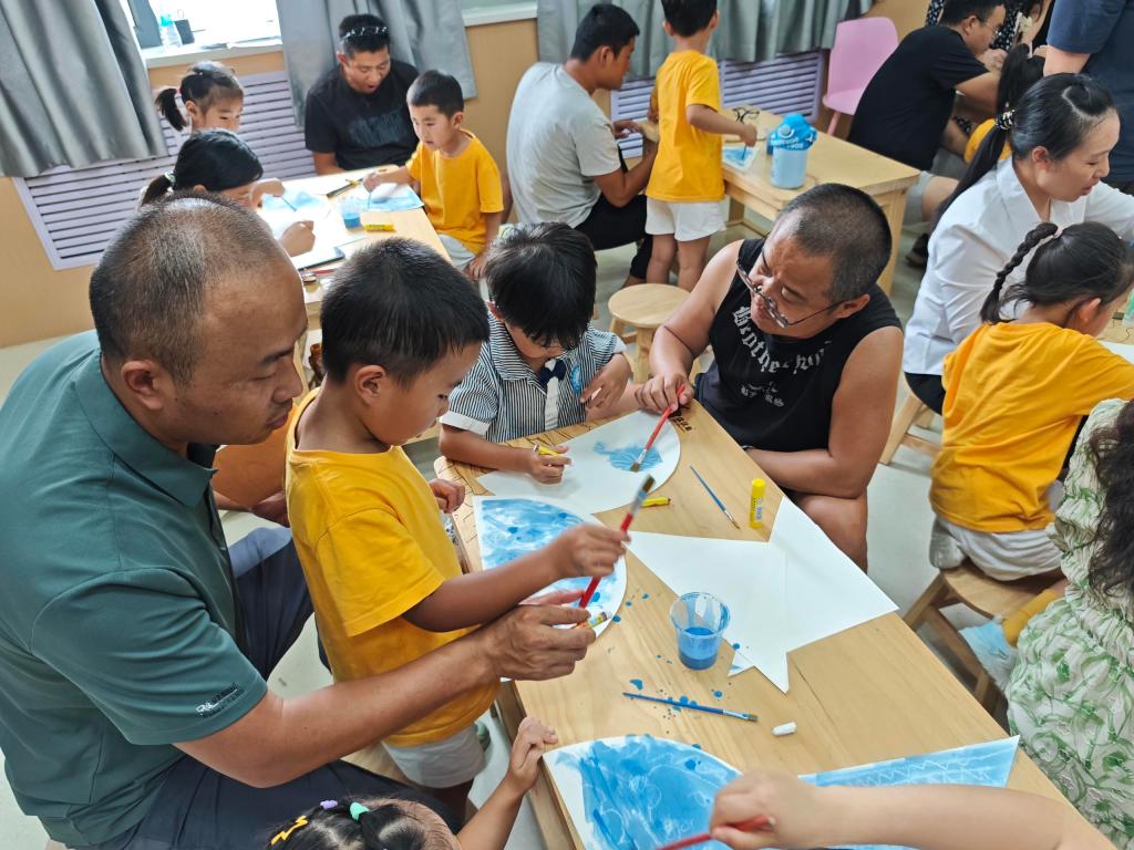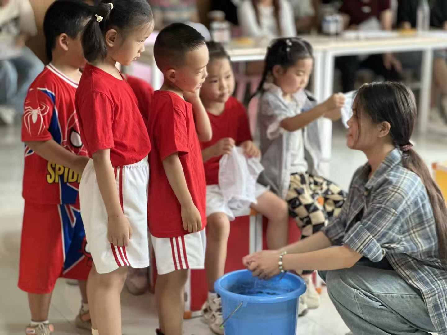 学院美术教研室教师全程授课,将高难度的传统技艺转化为适合亲子操作的趣味体验。例如,在蜡染与扎染环节,教师简化了传统蜡染工序,提供预涂蜡底的白布,让幼儿用安全画笔填涂靛蓝染料,待蜡融化后呈现冰裂纹理。扎染环节则以皮筋捆扎纱布,引导幼儿通过“拧扎、染”观察色彩晕染效果。这样的活动设计,不仅让孩子们体验到了色彩的魔法,还培养了他们的动手能力和审美意识。