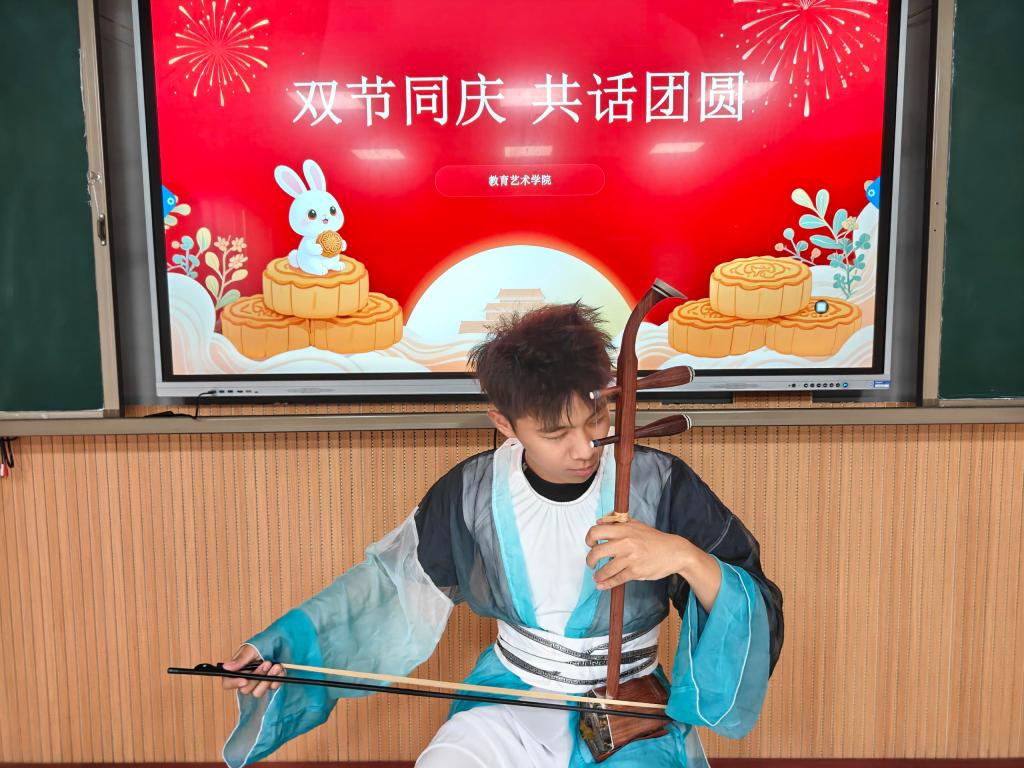 活动期间,25级音乐表演专业1班学生张嘉熠以古筝演奏《行者》与《渔舟唱晚》,通过细腻的指法传递出对祖国山河的热爱;24级音乐表演专业1班学生李计嵚则以二胡演绎《听松》和《光明行》,展示了传统乐器的魅力。