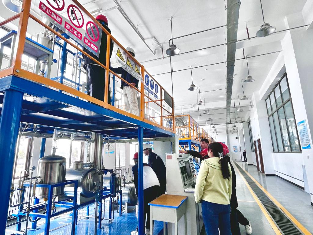 在化工单元操作实训车间,指导教师现场讲解设备操作规范、实训安全要点及大赛相关技巧,并指导学生参与精馏开车、稳定生产等实际操作环节,帮助学生将所学知识转化为实践技能。