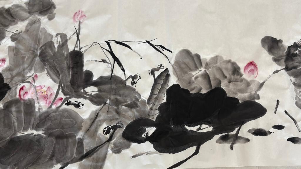 活动现场,王老师以写意国画为核心,现场创作六尺大作《清风荷韵》。运笔间,荷叶的浓淡层次、荷花的灵动姿态跃然纸上,其对“留白”哲学的精妙运用与“气韵生动”的创作追求,让在场师生直观感受到传统国画的美学境界。随后,王老师还展示了两幅国画小品,从构图设计到笔墨技巧,逐一拆解创作思路,为师生提供鲜活的学习范本。师生们在笔墨晕染间感悟中国画追求自然与笔墨和谐统一的审美理想,建立对民族艺术的文化自信。