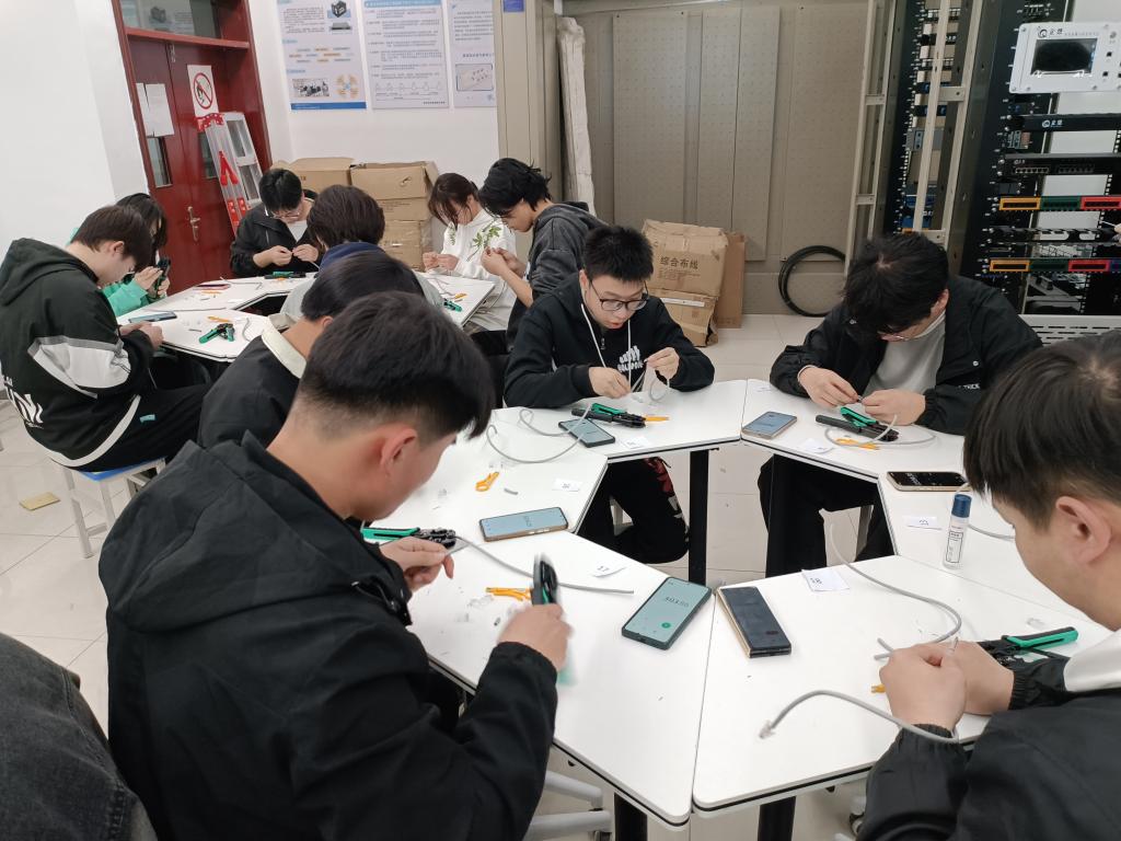 三大专业结合自身核心素养要求,同步开展特色实践活动:计算机网络技术专业以“真实网络场景”为核心,举办“网络搭建竞速赛”,学生小组在规定时间内完成网线制作;软件技术专业将课堂变为 “代码创意工坊”,发起“代码创意挑战赛”,设置“趣味小程序开发”与“代码艺术创作”赛道,学生们发挥想象开发“程序员节专属表情包生成器”,用代码绘制“二进制爱心”“编程语言logo拼图”等;物联网技术专业聚焦“技术落地应用”,开展“智能场景搭建赛”,学生利用传感器、单片机等设备,自主设计搭建“智能教室灯光控制系统”。