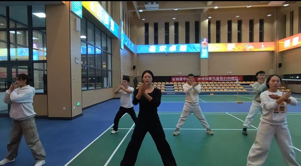 比赛现场,伴随着舒缓悠扬的音乐,学院教师身着统一服装,迈着稳健的步伐登场。教师们身姿挺拔、神情专注,起势沉稳有力,招式舒展大方,一系列动作衔接自然、行云流水,既展现出八段锦的柔美与韵味,又蕴含着内在的刚劲与力量。他们整齐的阵型、规范的动作与良好的精神风貌,赢得了评委的一致认可和现场观众的阵阵掌声。