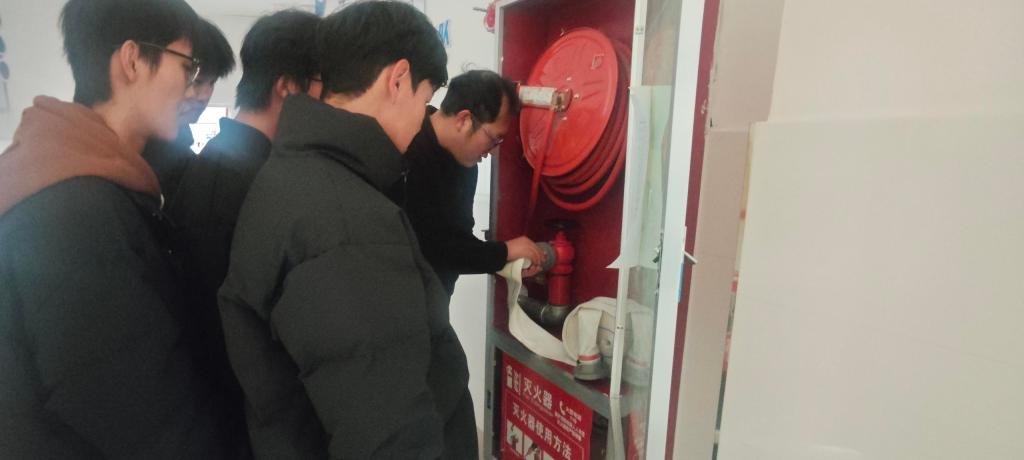 在器材实操教学环节,老师演示灭火器及消火栓使用步骤及注意事项,学生进行分组实操。25级应用化工技术1班学生何亚特表示:“以前只在视频里看,亲手试才知道灭火器拔销要快,喷头得对准火焰根部!”。
