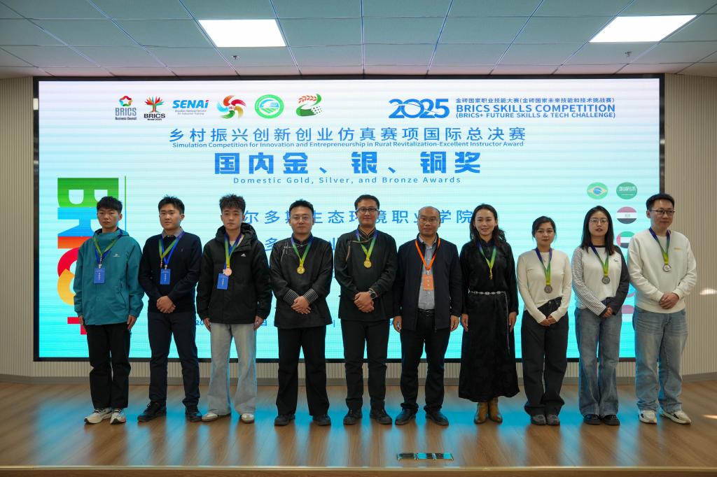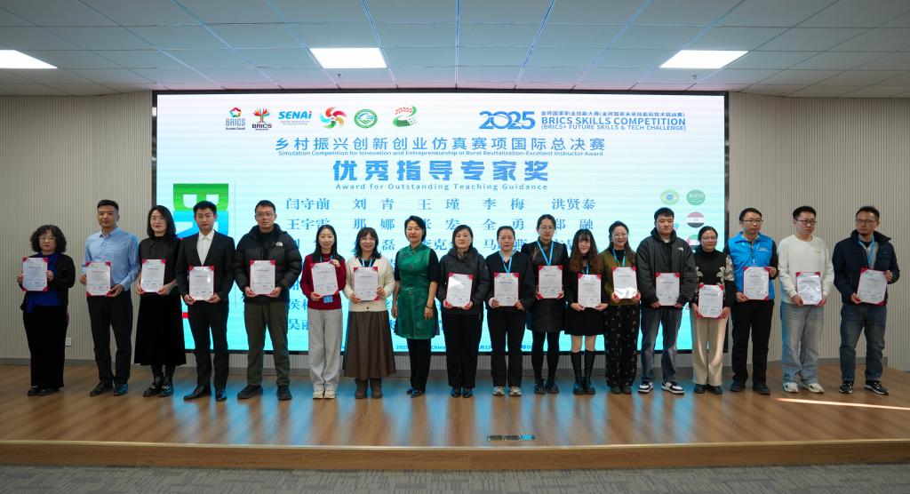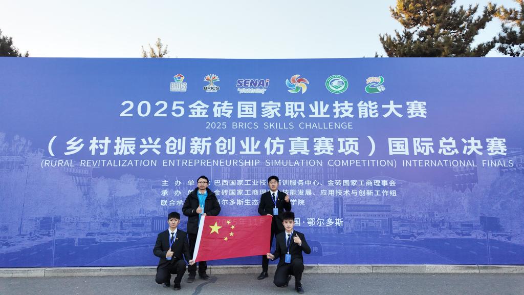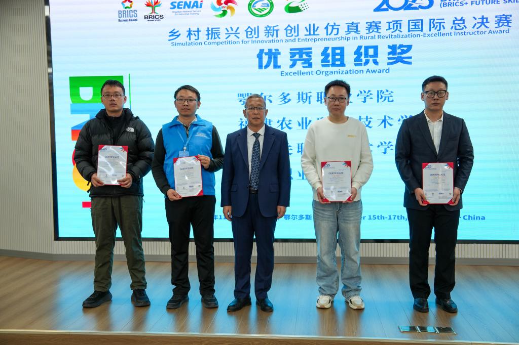 11月15日至17日,2025金砖国家职业技能大赛(乡村振兴创新创业仿真赛项)国际总决赛在鄂尔多斯生态环境职业学院举办。bat365在线中国官网登录入口现代农业学院24级现代农业经济管理1班王浩、王存政、李天航三位同学组成的代表队表现卓越,凭借扎实的专业功底和出色的创新能力,荣获大赛铜奖。学院同时获得“优秀组织奖”,指导教师王宇雷、洪贤泰获“优秀指导专家”奖。