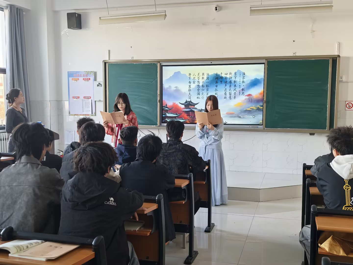 语文课堂上,《言值挑战赛》让古诗词“活”起来。学生以小组为单位抽签选取经典诗词,在限定时间内完成情景剧创编与演绎。同学们自编自导自演,将无声的文字转化为有声的戏剧,在沉浸式体验中品味诗词意境、传递文化内涵,同时有效提升语言组织、舞台表现与创造性思维能力。
