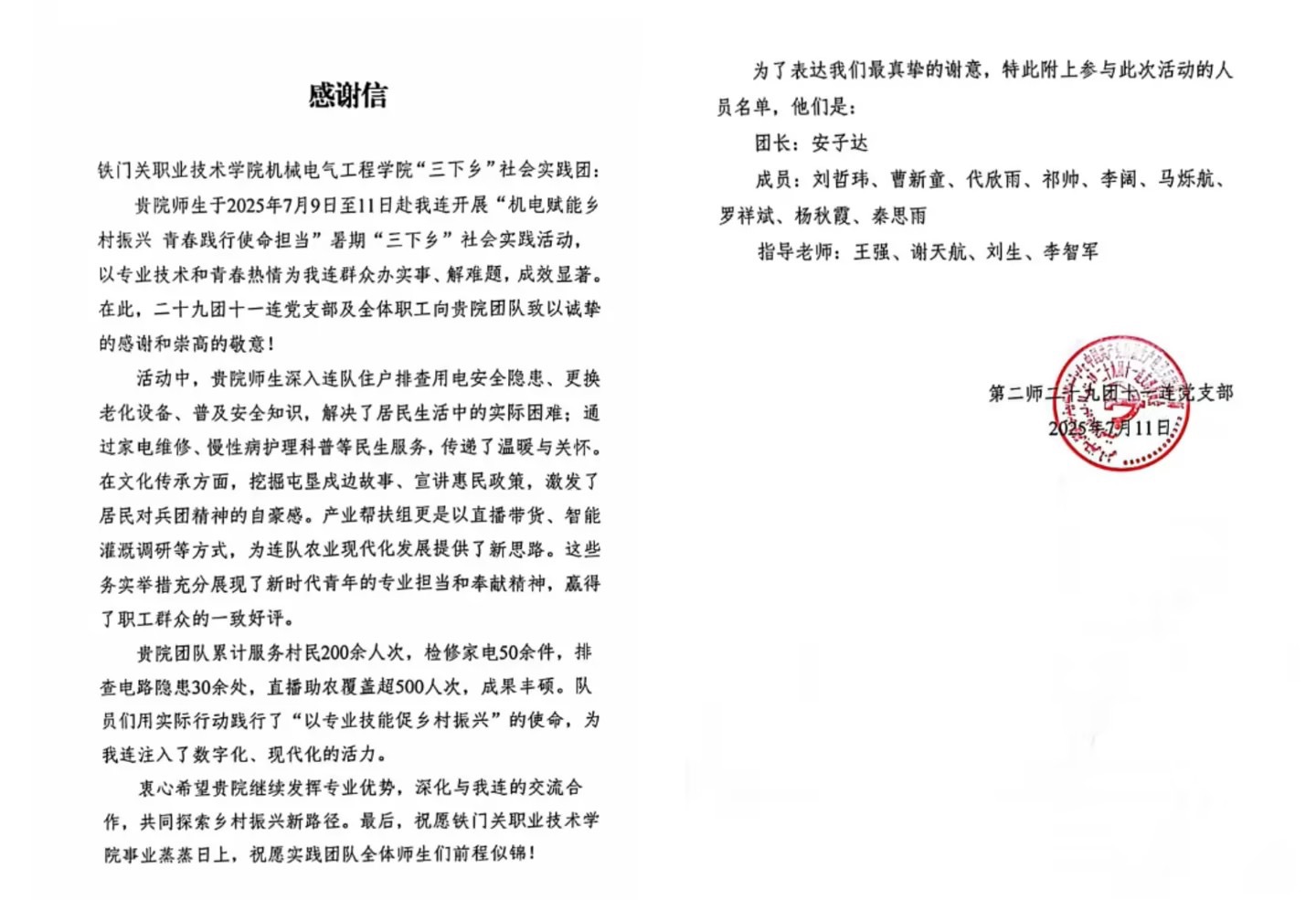 分享会上,3支实践队以图文并茂的形式,立体呈现了扎根基层的青春答卷。“机电惠农”实践队深耕兵团第二师二十九团连队一线,以用电安全排查、家电维修、智能农机调研等专业服务,精准破解群众“急难愁盼”;“文化润疆”实践队穿行于连史馆与党史馆,通过访谈老军垦、编排政策情景剧、搭建民族文化交流平台,让红色基因在青春传承中焕发新生,让民族团结之花绚丽绽放;“智慧兴农”实践队立足田间地头,以直播助农、3D打印教学、智能设备调研等创新举措,为乡村振兴注入科技动能,彰显了职业教育服务产业发展的鲜明底色。