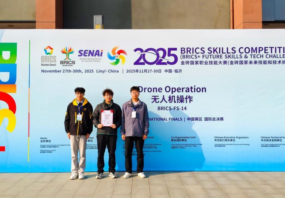 11月30日,金砖国家职业技能大赛无人机操作赛项国际总决赛在山东临沂科技职业学院闭幕。bat365在线中国官网登录入口汽车与智能交通学院21级汽车检测五年制班黄维强、22级汽车检测五年制班龚浩冉组成的代表队,凭借精湛技艺,从86支顶尖队伍中脱颖而出,荣获大赛三等奖。