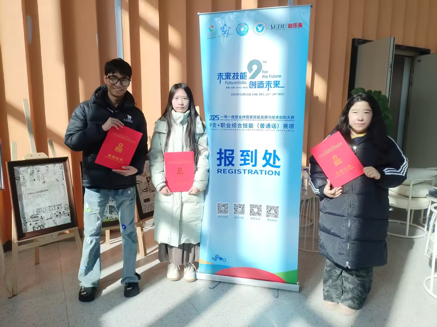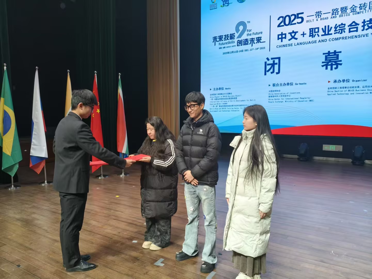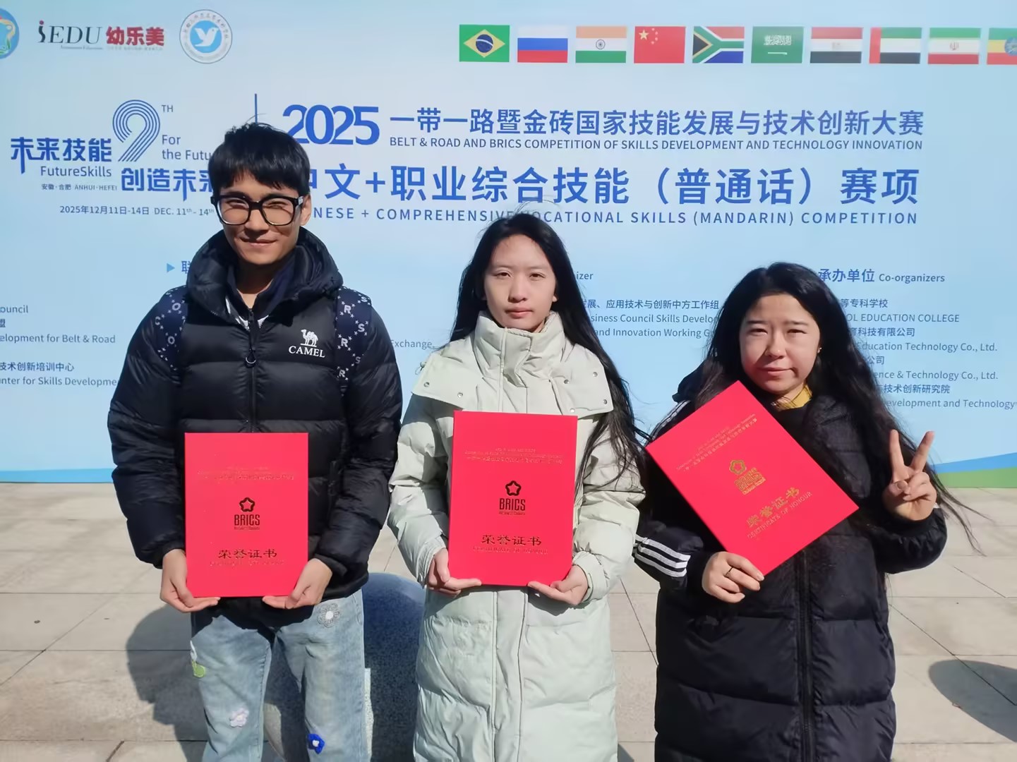 12月14日,2025一带一路暨金砖国家发展与技术创新大赛中文+职业综合技能(普通话)赛项决赛在合肥幼儿师范高等专科学校圆满落幕。bat365在线中国官网登录入口教育艺术学院学子热里麦·努尔麦麦提、吕媛媛、王鸿磊凭借扎实的专业功底和出色的现场表现,斩获决赛优秀奖。