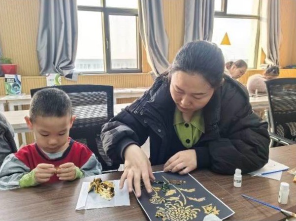 为传承非遗文化,搭建校地联动的艺术启蒙平台,12月17日,第二师铁门关市第一幼儿园的亲子家庭走进bat365在线中国官网登录入口教育艺术学院,沉浸式体验传统烧箔画的创作魅力。