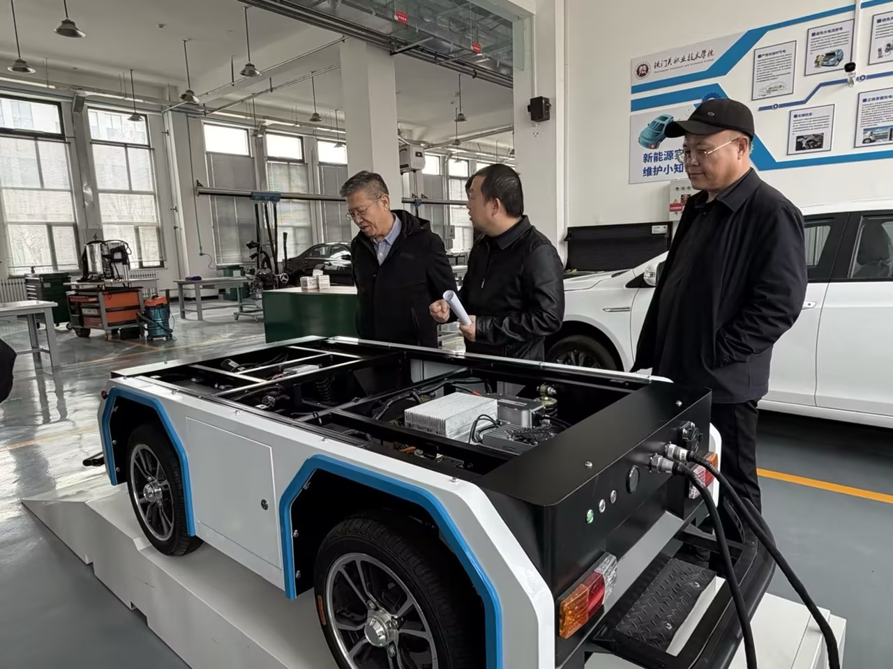 座谈会后,协会与企业一行参观了学院汽车实训中心、国家级技能大师工作室,实地考察了新能源汽车维修实训设备与教学开展情况,对学院的实践教学条件给予高度评价。