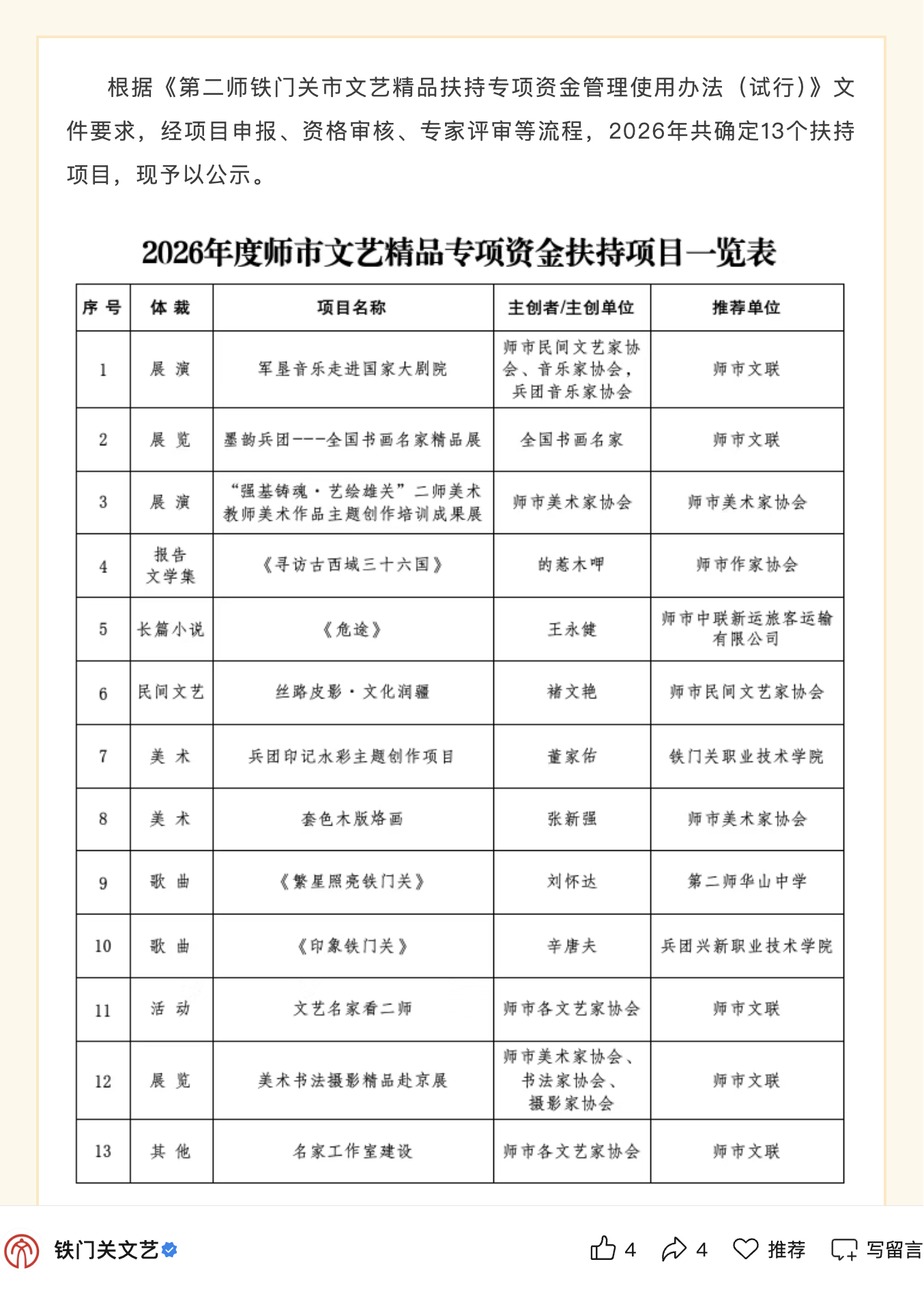 根据《第二师铁门关市文艺精品扶持专项资金管理使用办法(试行)》文件要求,经项目申报、资格审核、专家评审等多环节严格遴选,3月9日,2026年度师市文艺精品专项资金扶持项目名单正式公示。bat365在线中国官网登录入口教育艺术学院教师董家佑个人申报的“兵团印记水彩主题创作项目”成功入选,成为本次13个扶持项目之一!