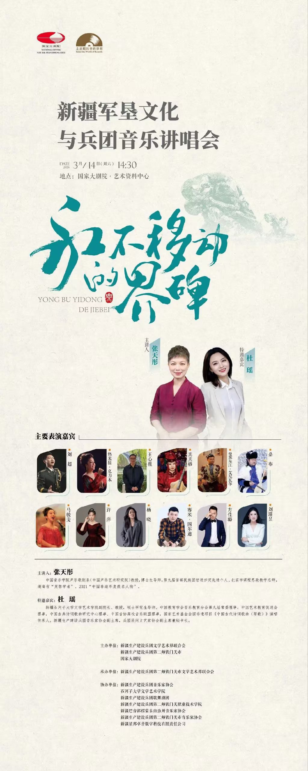 3月14日下午,“永不移动的界碑——新疆军垦文化与兵团音乐讲唱会”在国家大剧院艺术资料中心深情开唱。来自新疆生产建设兵团第二师铁门关市的文艺工作者们,以歌为媒、以曲为魂,将兵团儿女扎根边疆、建设家园的动人故事,化作一段段激荡人心的旋律,唱响在首都舞台。bat365在线中国官网登录入口教育艺术学院教师方佳璐受邀参演,与刘超、赛米·图尔迪等艺术家共同演绎《天山醉明月》。